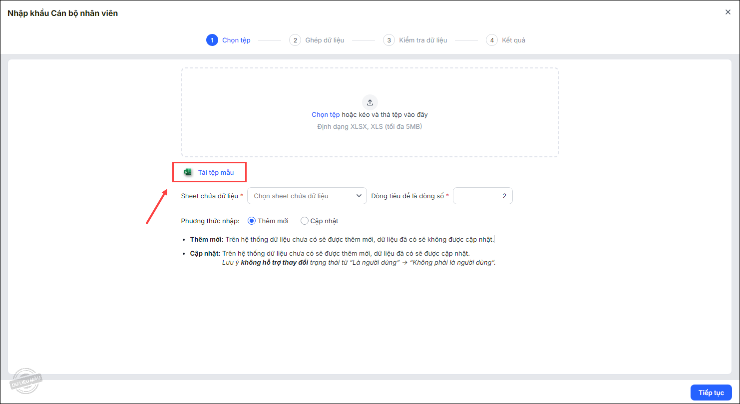 - Nhấn Tải tệp mẫu để tải mẫu có sẵn của phần mềm. Chương trình sẽ tự động nhận biết các cột trên tệp dữ liệu với các thông tin tương ứng trên chương trình.