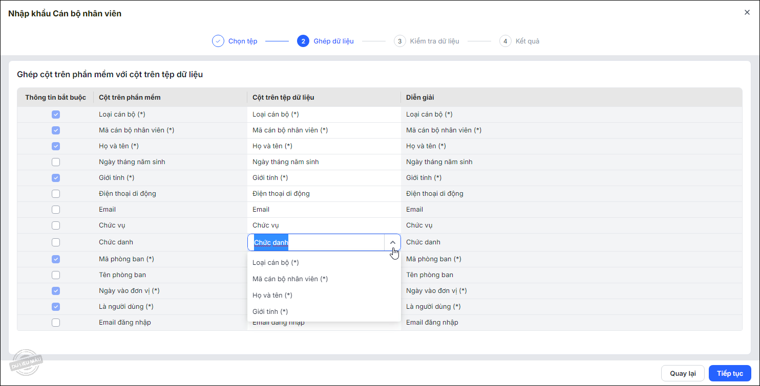- Chương trình tự động ghép thông tin ở Cột trên tệp dữ liệu với Cột trên phần mềm. Nếu chương trình chưa ghép dữ liệu hoặc ghép chưa đúng, anh chị có thể chọn lại thông tin Cột trên tệp dữ liệu để ghép cho chính xác.
