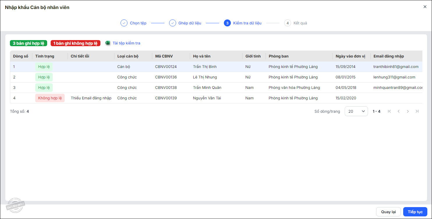 - Đôi với bản ghi không hợp lệ, hệ thống hiển thị nguyên nhân ở cột Chi tiết lỗi.