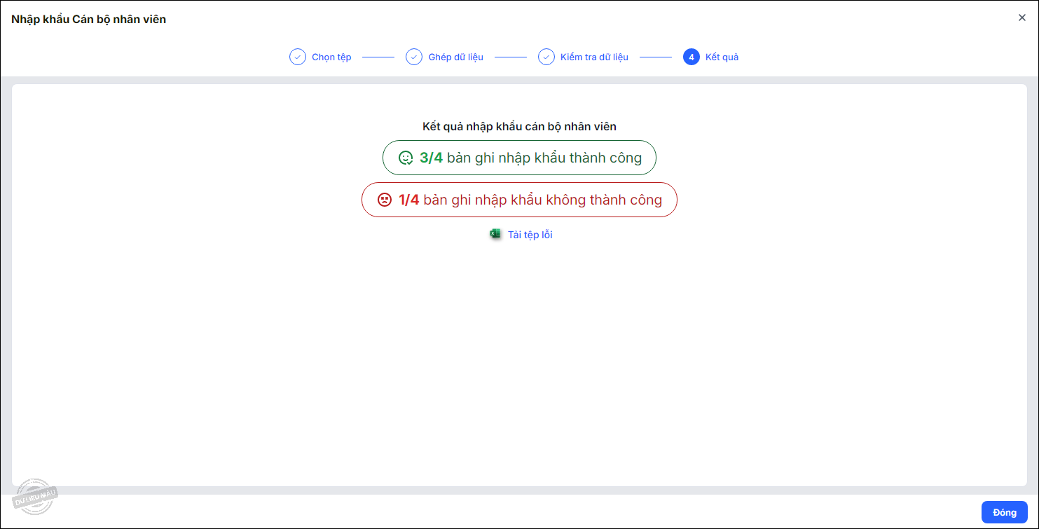 - Phần mềm hiển thị kết quả nhập khẩu. Trường hợp có bản ghi nhập khẩu không thành công, có thể chọn Tải tệp lỗi để xem chi tiết.