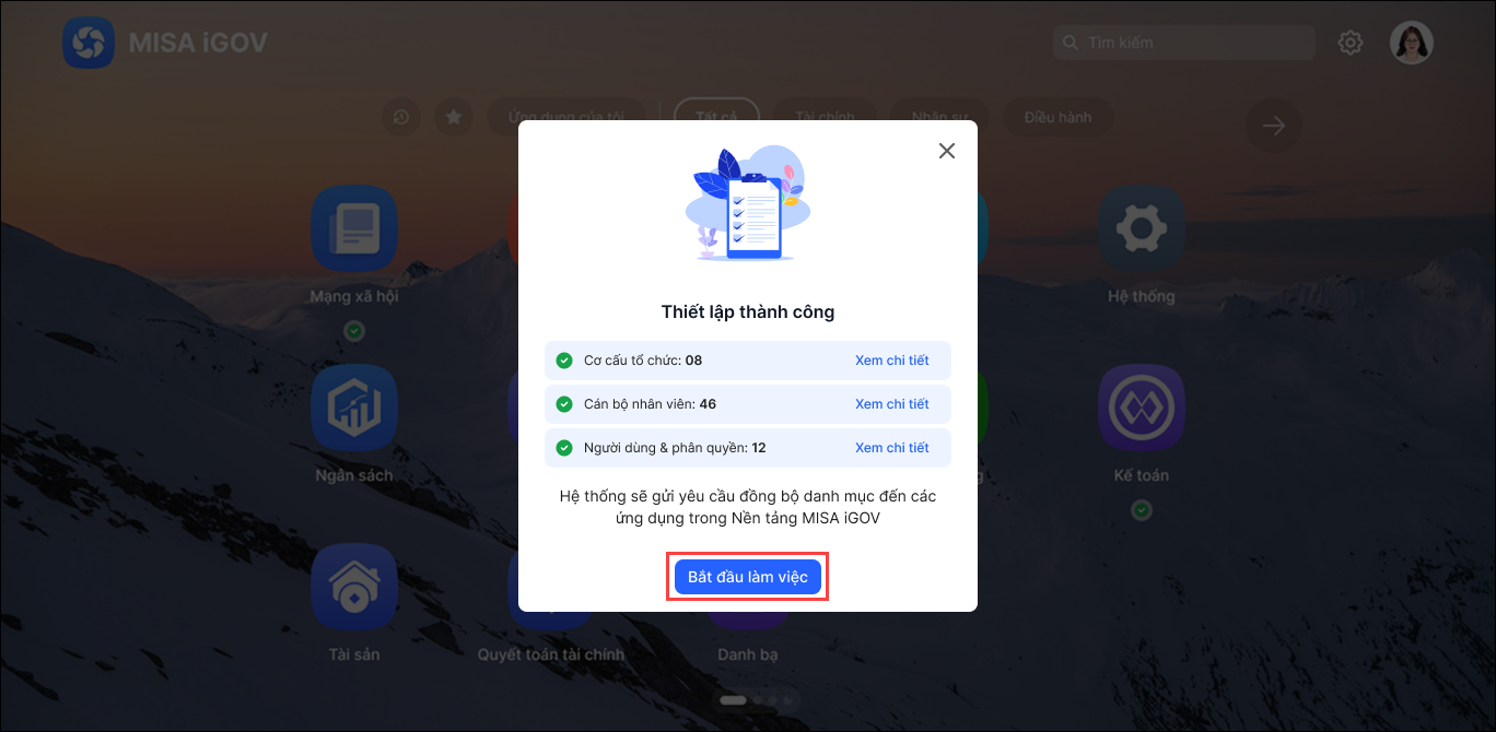 Lúc này, anh/chị chọn Bắt đầu làm việc trên nền tảng MISA iGOV.