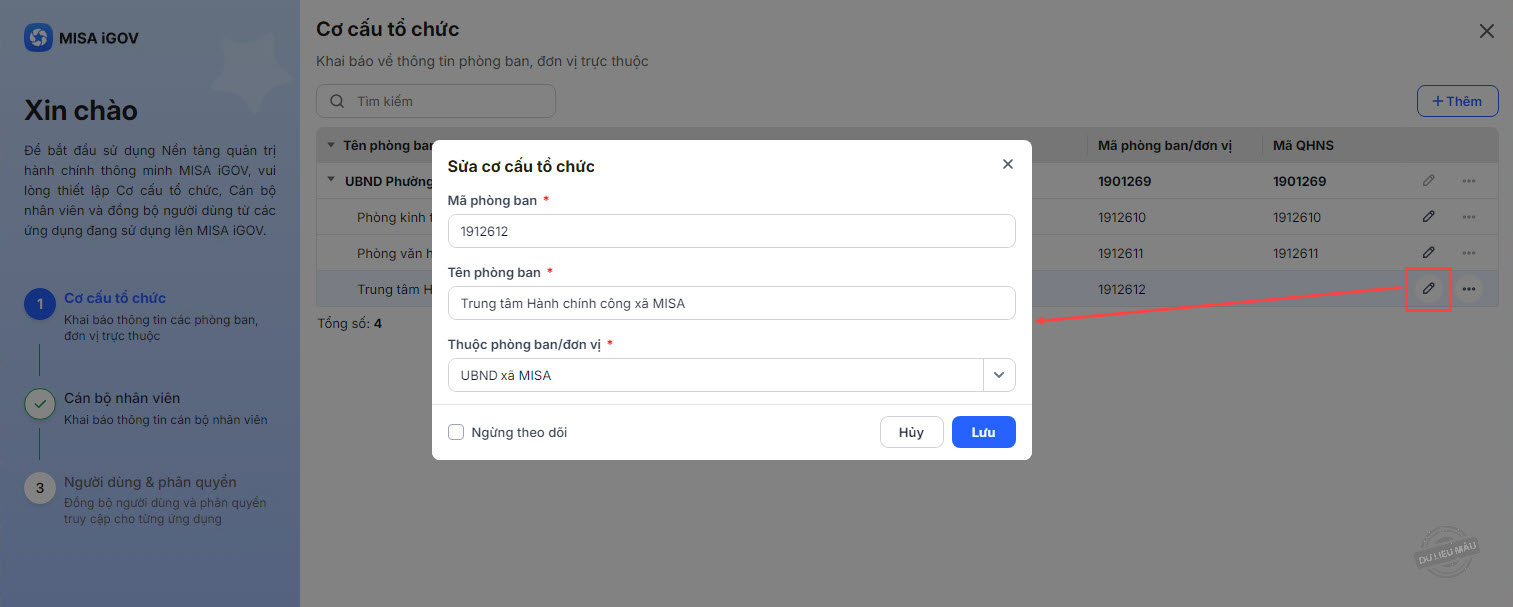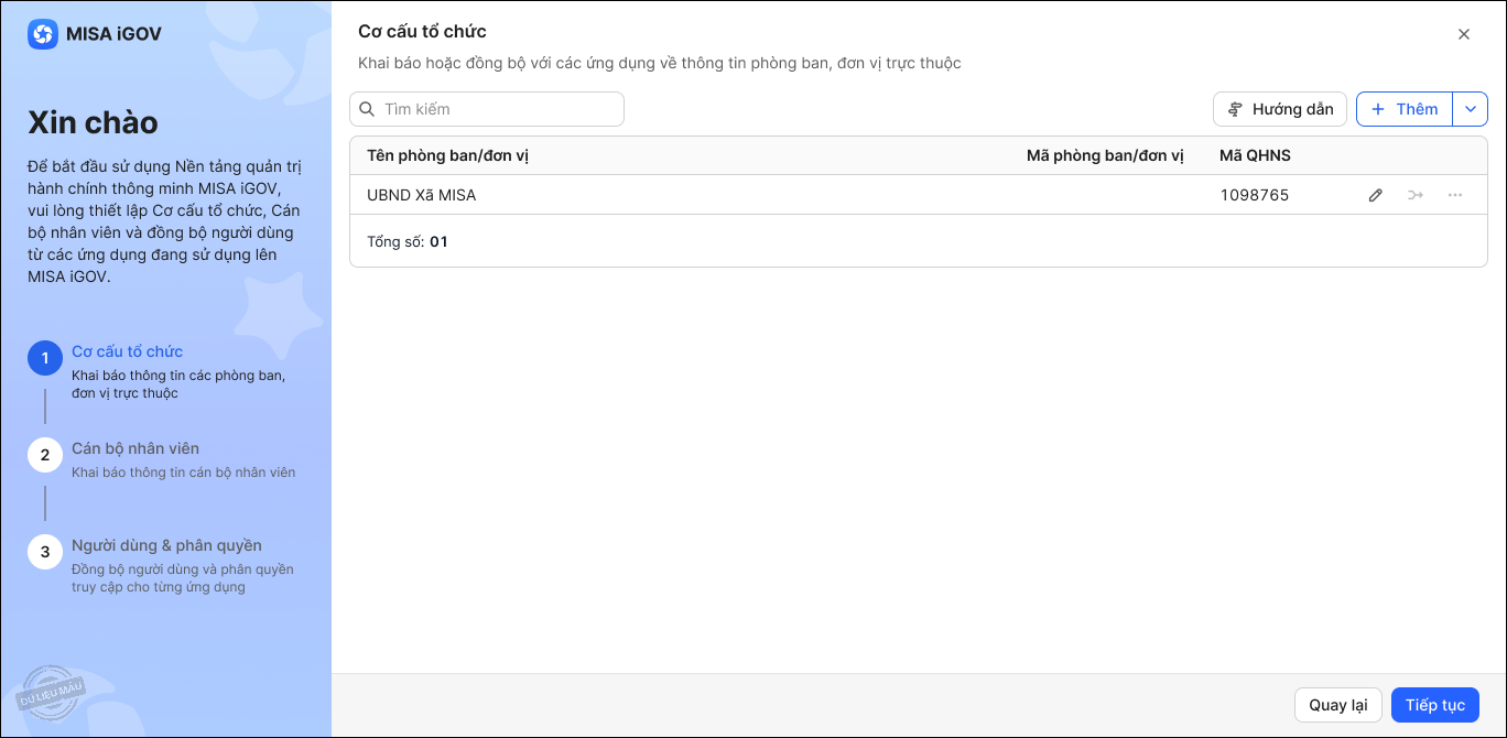 3. Trường hợp đơn vị chỉ đăng ký sử dụng nền tảng cho UBND xã, anh/chị bắt buộc phải khai báo thêm ít nhất 1 phòng ban trực thuộc để hoàn tất thiết lập cơ cấu tổ chức.