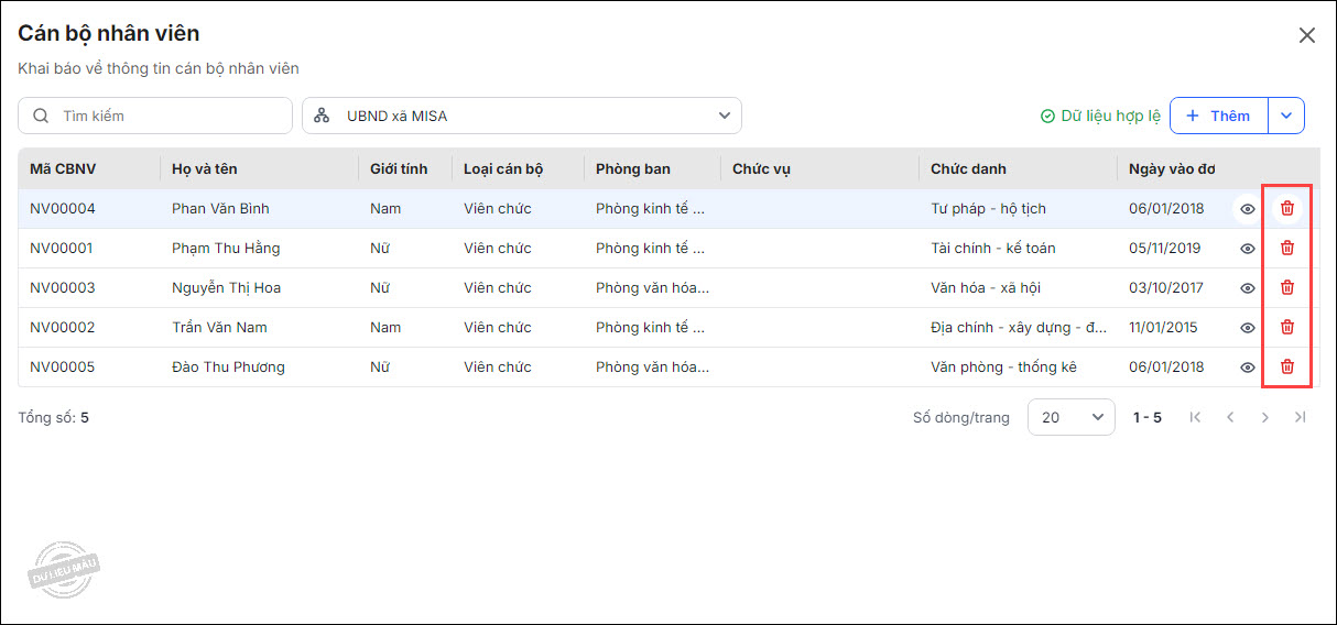 4. Có thể xóa CBNV bằng cách chọn vào biểu tượng Xóa tại dòng thông tin CBNV.