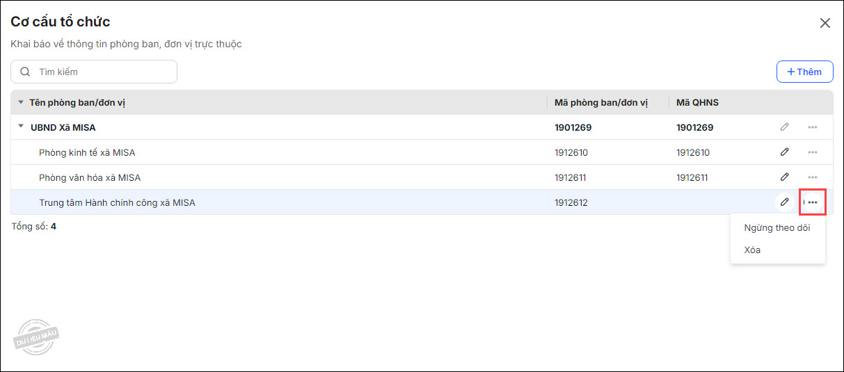 5. Có thể chọn ngừng theo dõi hoặc xóa phòng ban đang có bằng cách nhấn vào biểu tượng ⋯ ở cuối dòng và chọn chứng năng tương ứng.