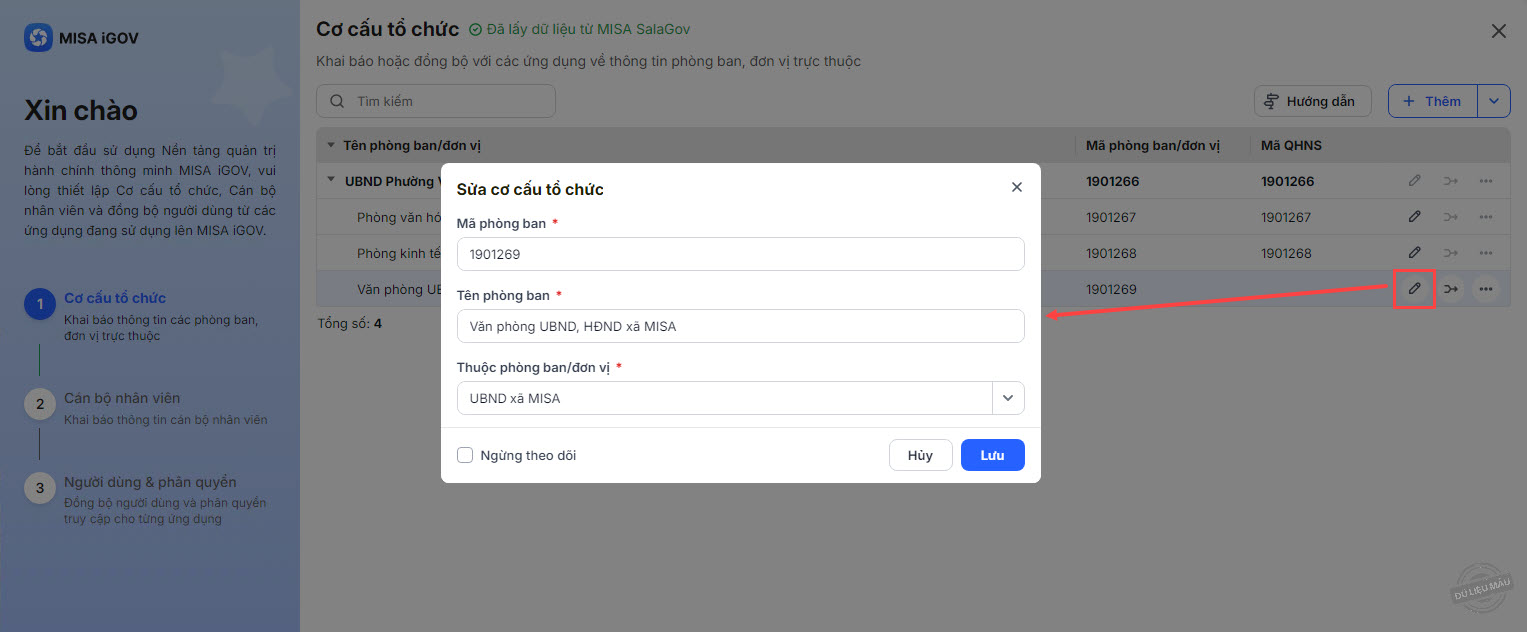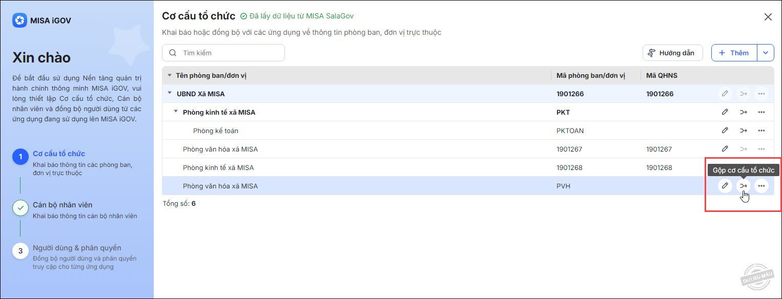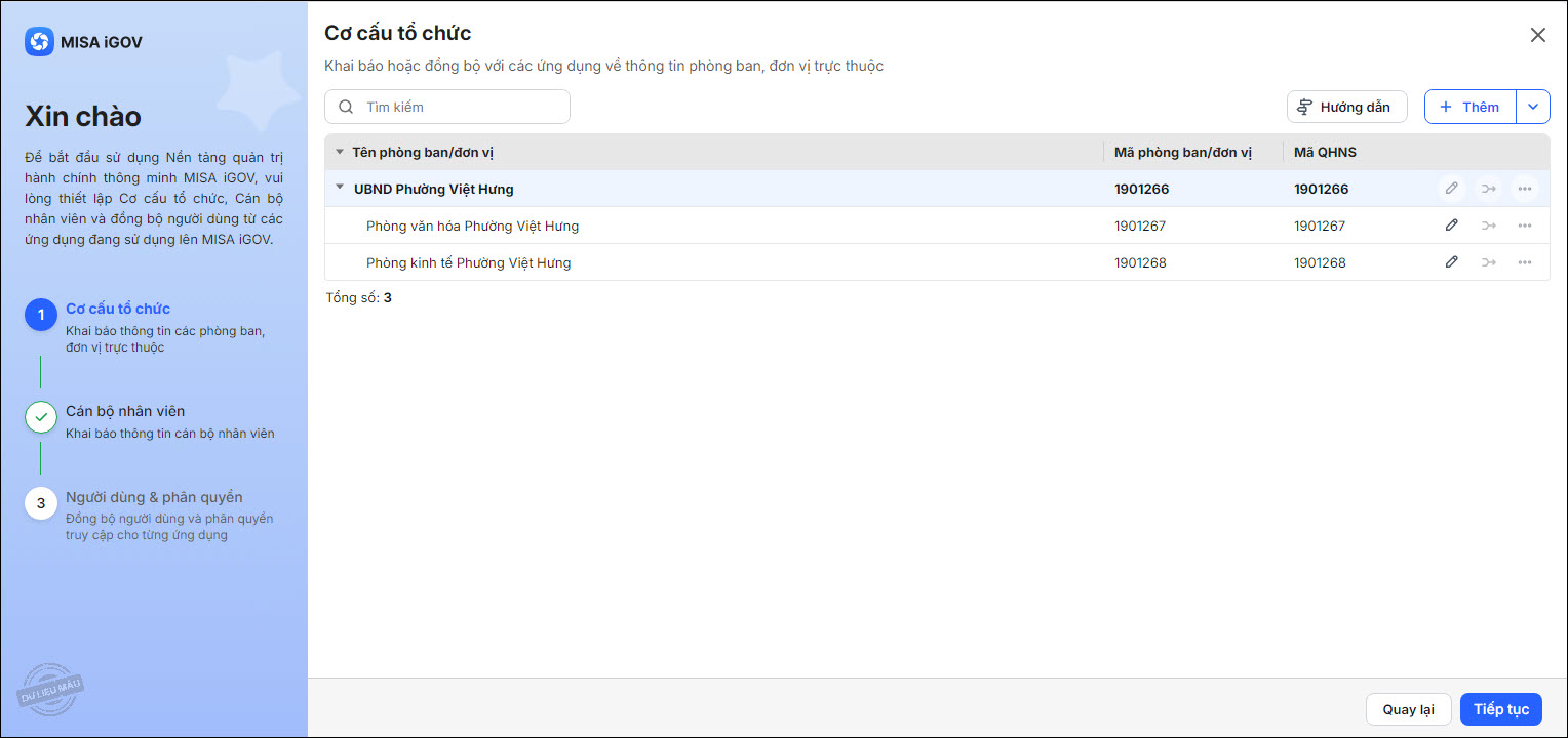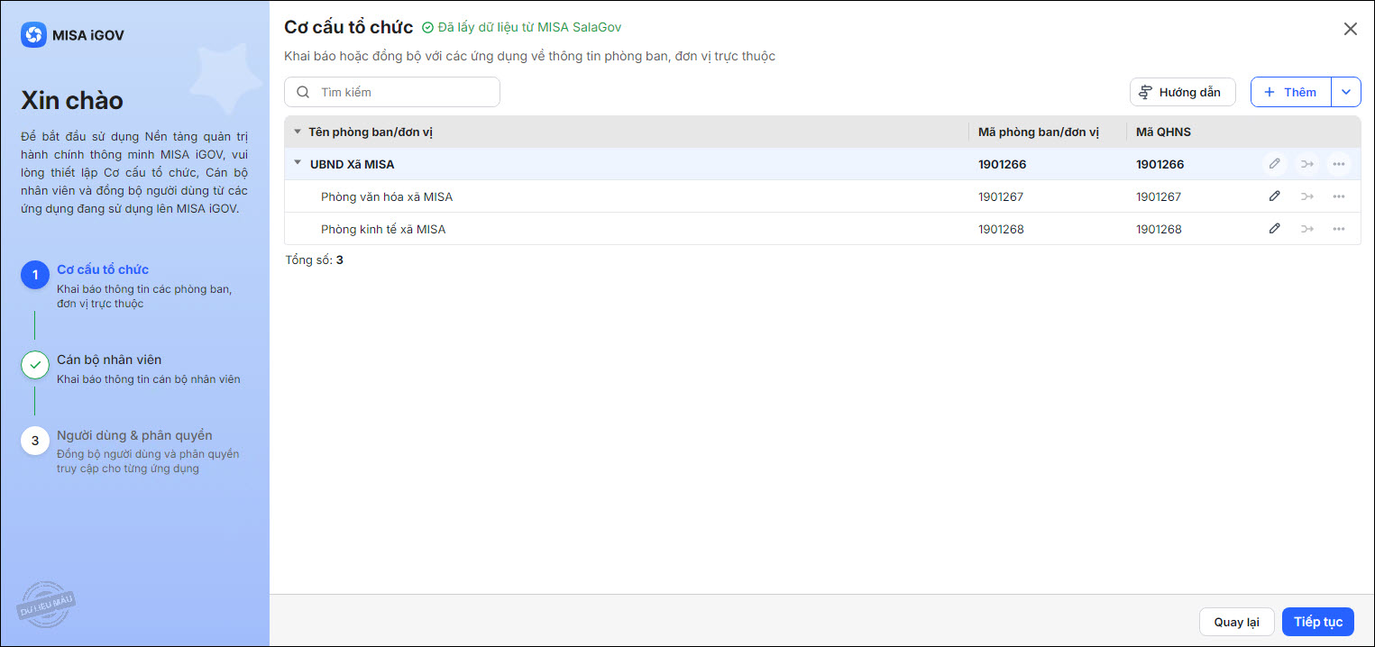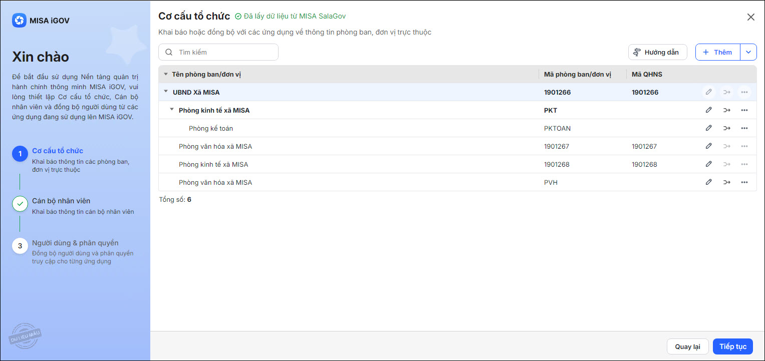 - Hệ thống sẽ lấy cơ cấu tổ chức từ ứng dụng đã chọn lên nền tảng MISA iGOV, đồng bộ các đơn vị, phòng ban theo mã QHNS tương ứng với nhau.