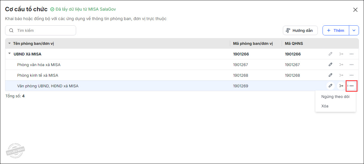 - Có thể chọn ngừng theo dõi hoặc xóa phòng ban đang có bằng cách nhấn vào biểu tượng ⋯ ở cuối dòng và chọn chứng năng tương ứng.