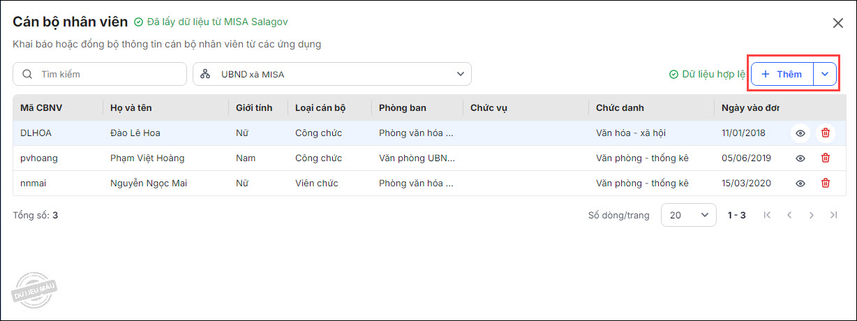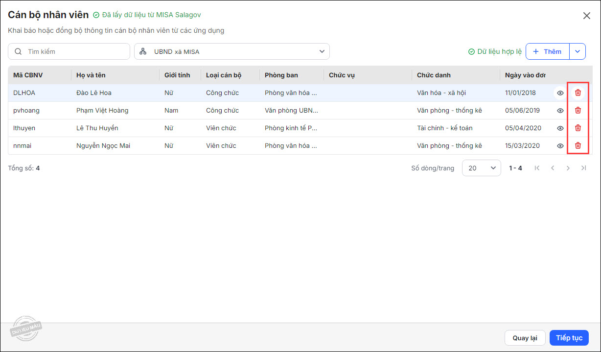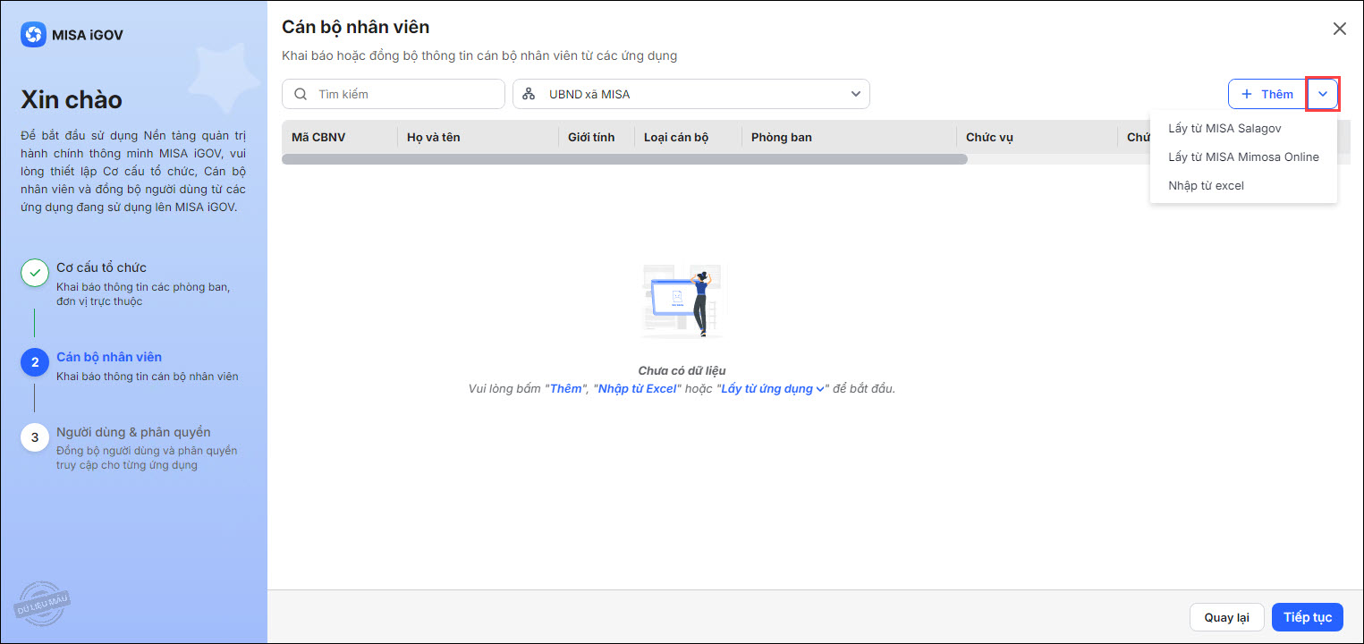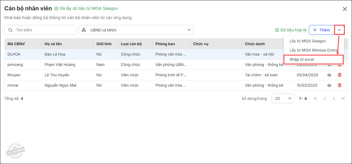 - Tương tự như bước 1, anh/chị có thể lấy dữ liệu cán bộ nhân viên từ ứng dụng MISA Salagov hoặc MISA Mimosa online.