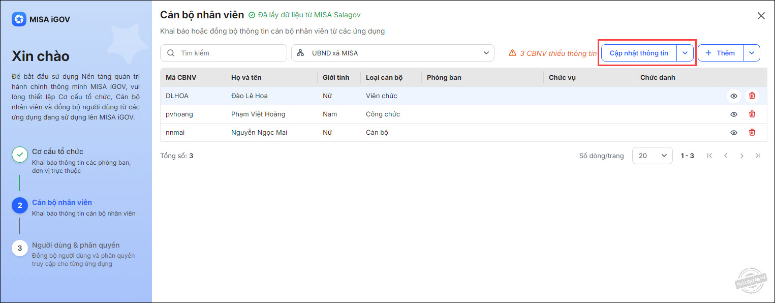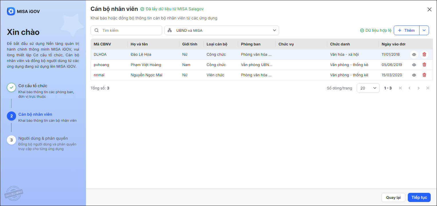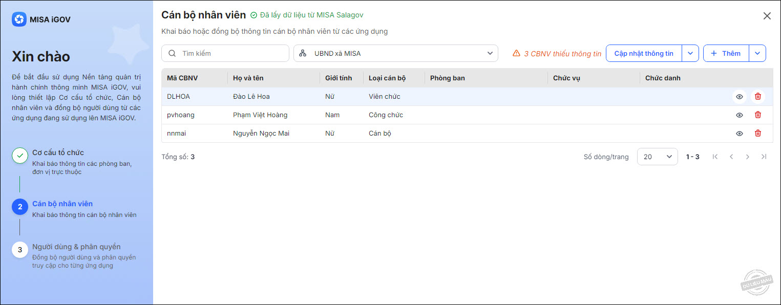 - Hệ thống sẽ đồng bộ CBNV từ ứng dụng đã chọn lên nền tảng MISA iGOV.