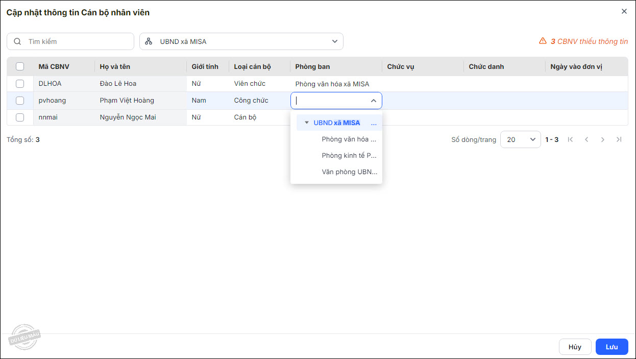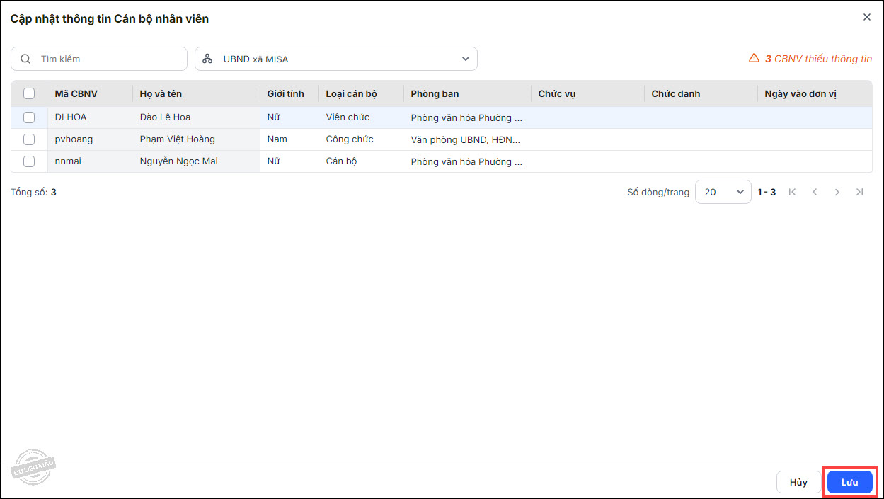 - Cập nhật thông tin cho từng CBNV: Bổ sung thông tin cho CBNV tại từng dòng tương ứng, nhấn Lưu.