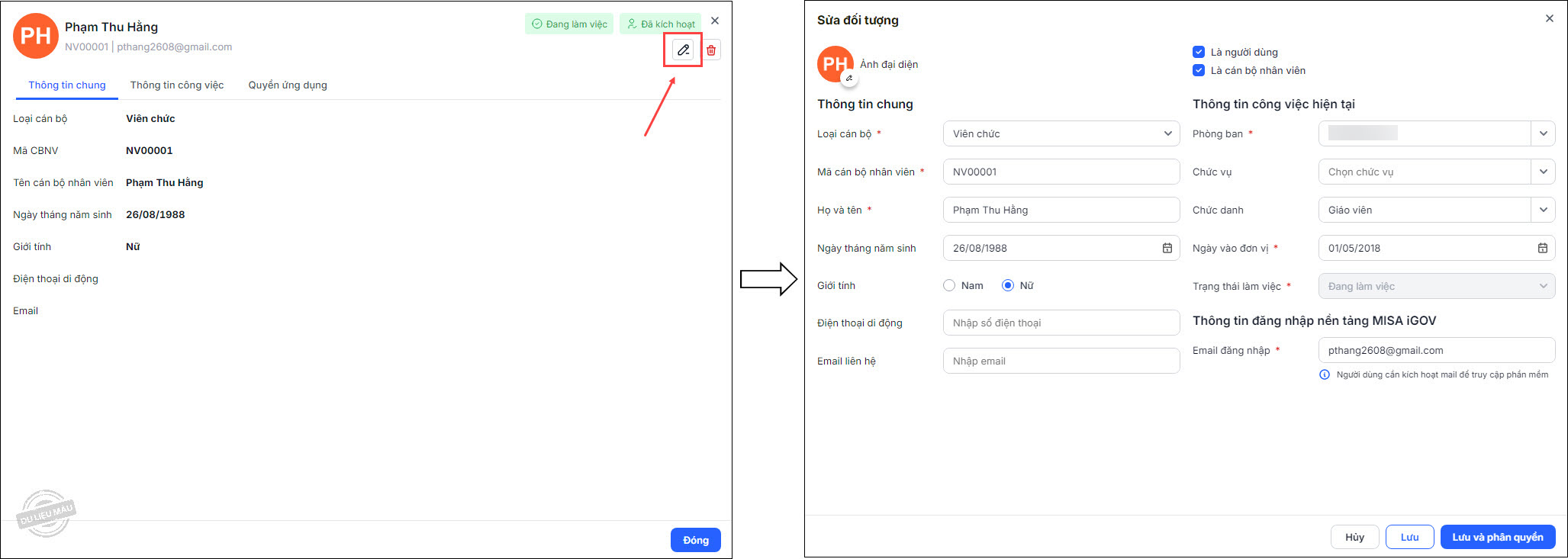 1. Để sửa thông tin CBNV: