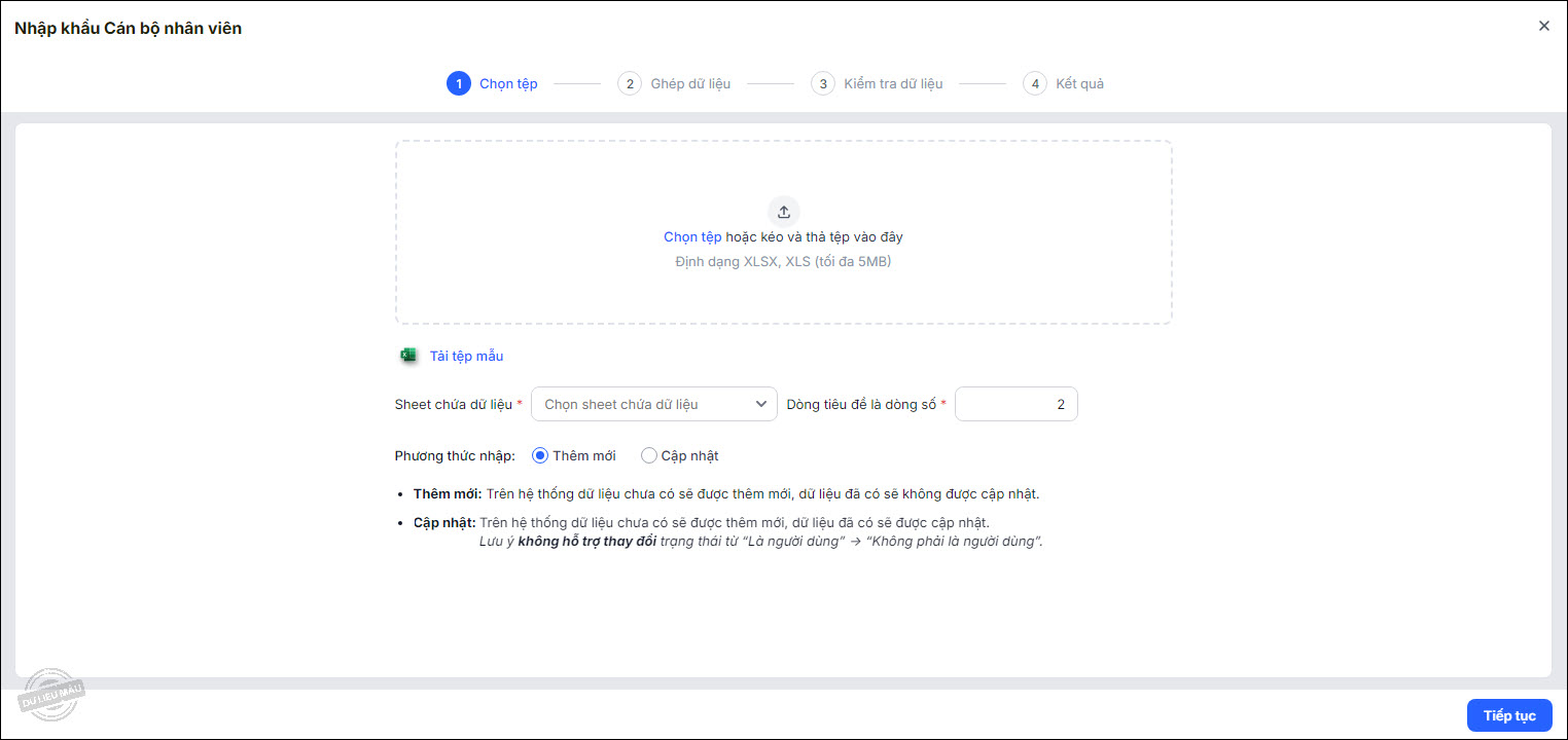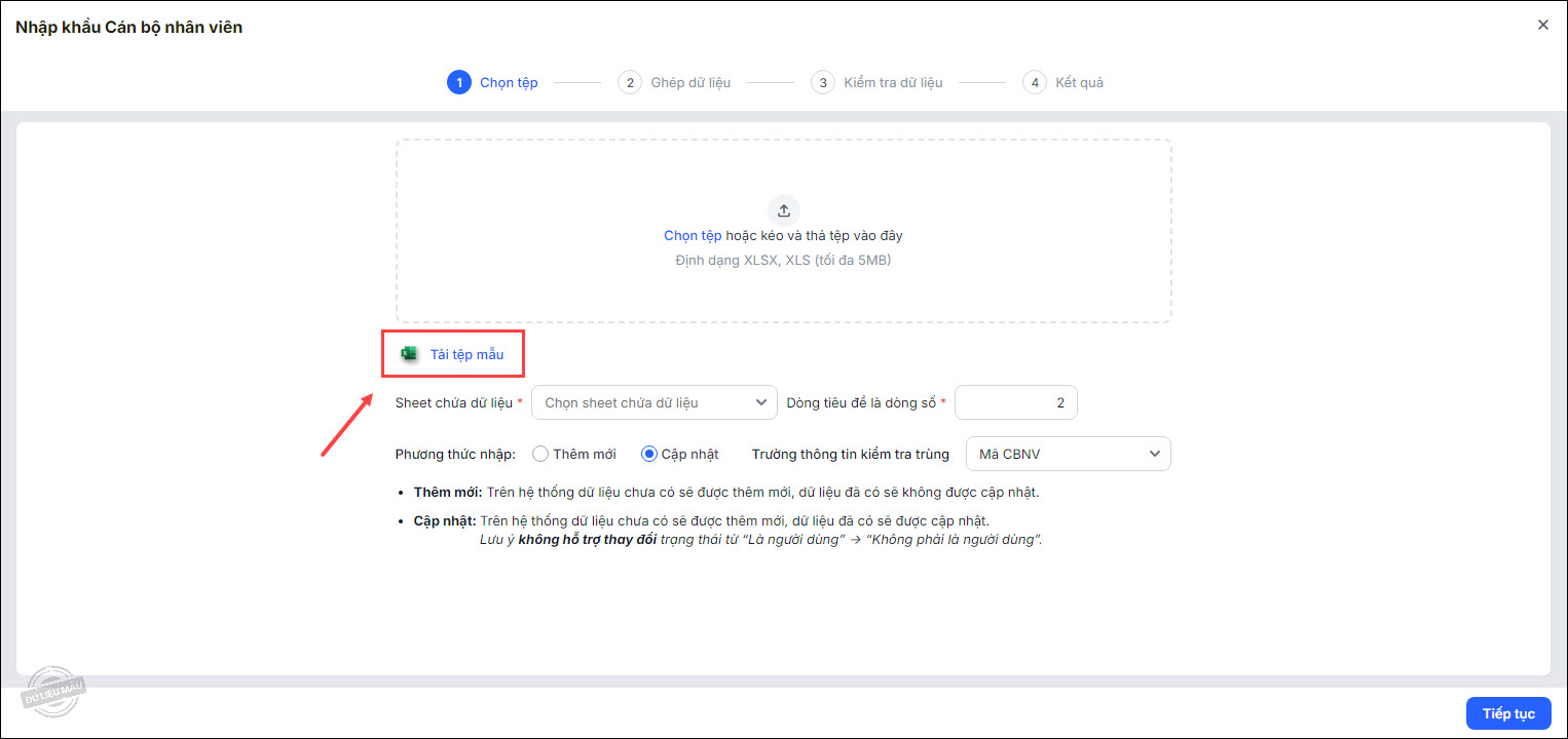 2. Anh chị tải tệp mẫu từ chương trình, khai báo danh sách CBNV và thực hiện nhập khẩu tương tự như trường hợp cập nhật thông tin CBNV hàng loạt từ excel.