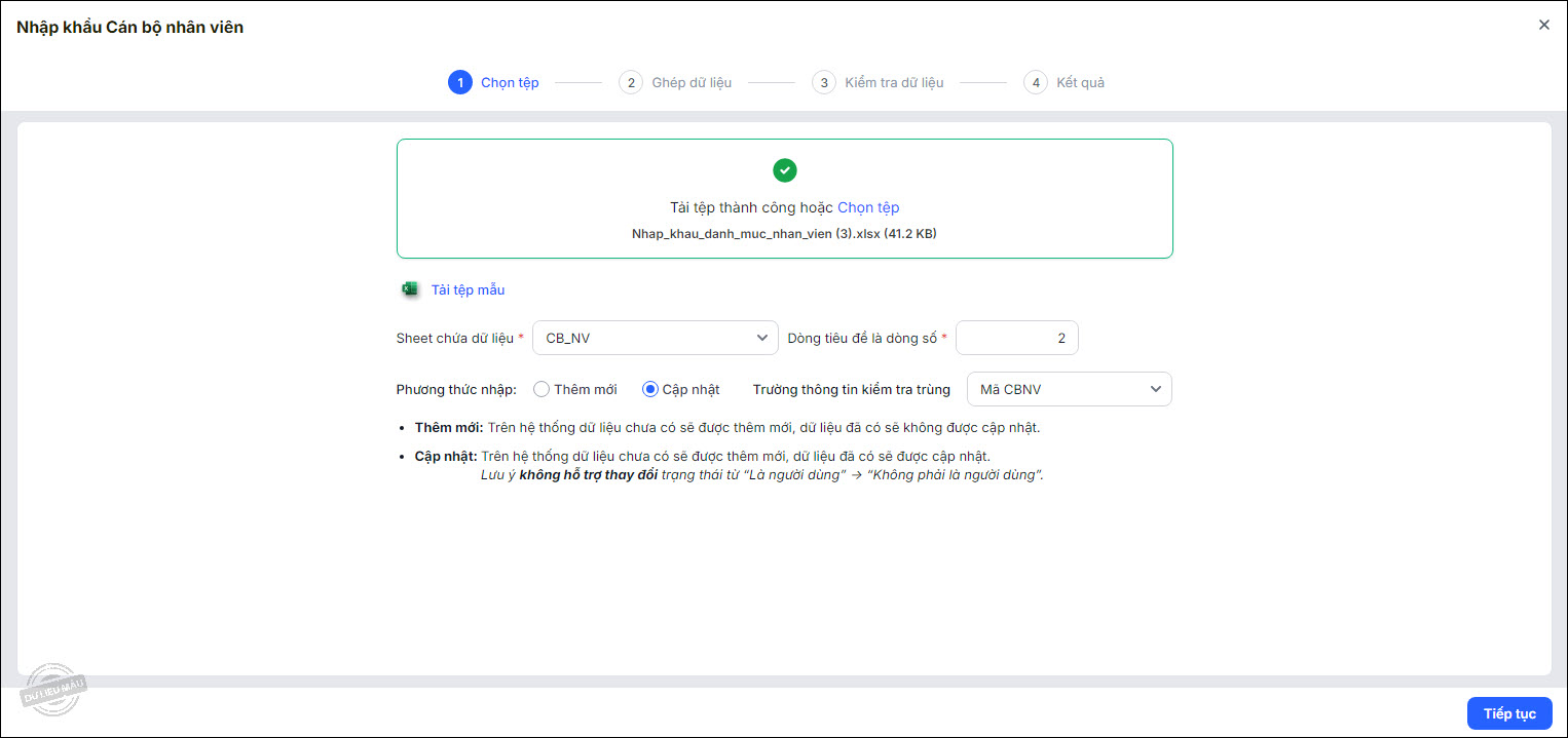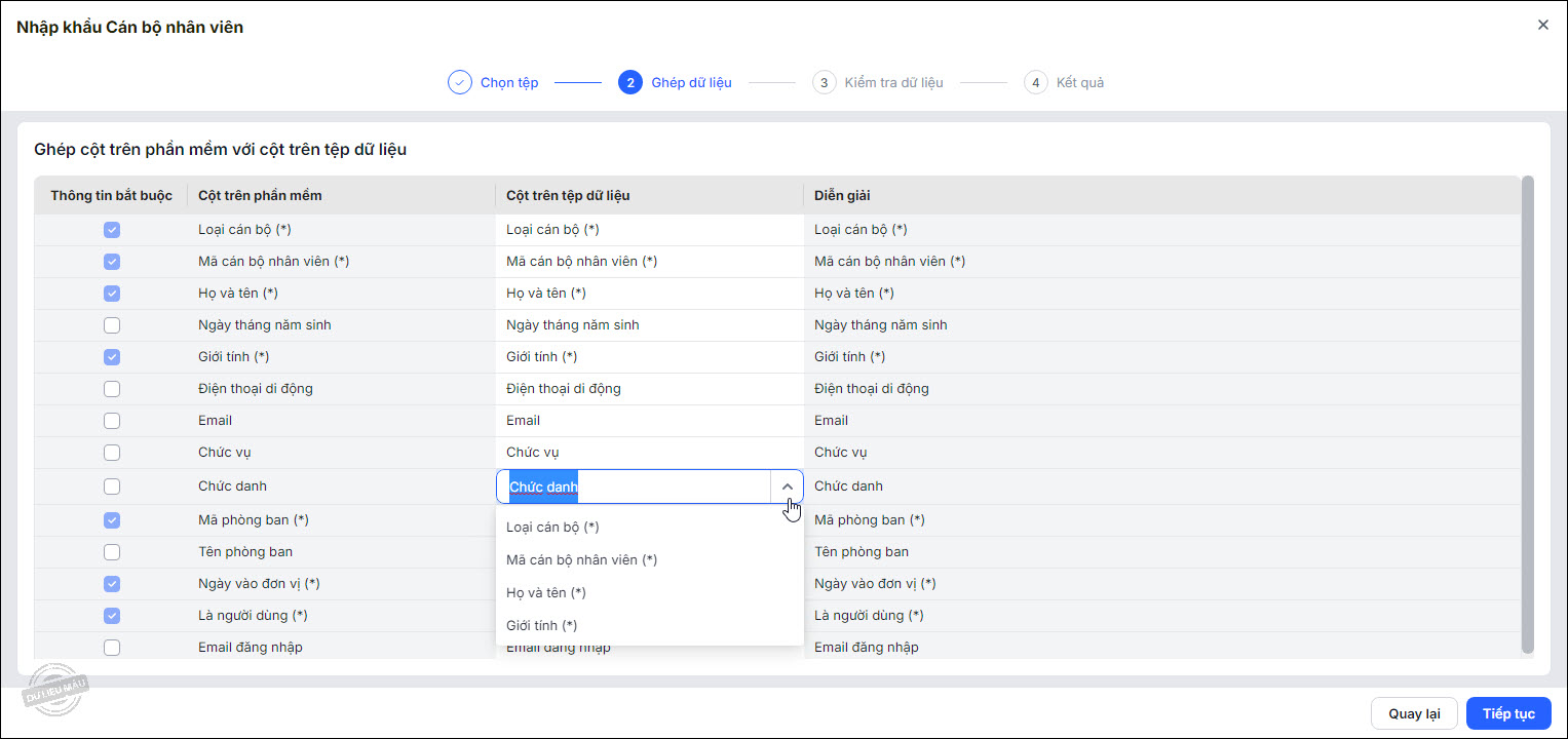 Lưu ý: Nếu ứng dụng lấy dữ liệu ở bước này khác với ứng dụng lấy dữ liệu ở bước 1, hệ thống sẽ để trống thông tin phòng ban của CBNV để anh/chị bổ sung sau.