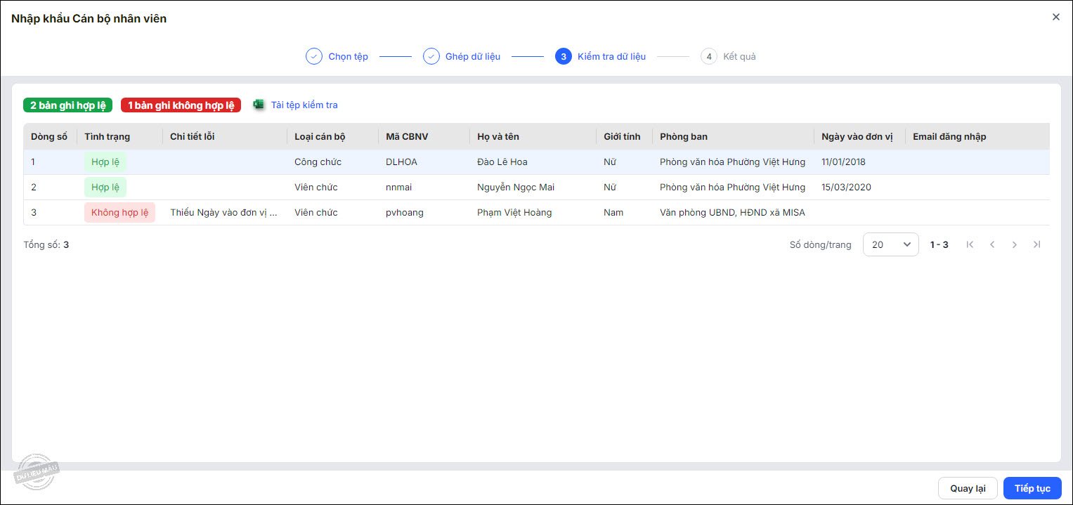 - Đôi với bản ghi không hợp lệ, hệ thống hiển thị nguyên nhân ở cột Chi tiết lỗi.