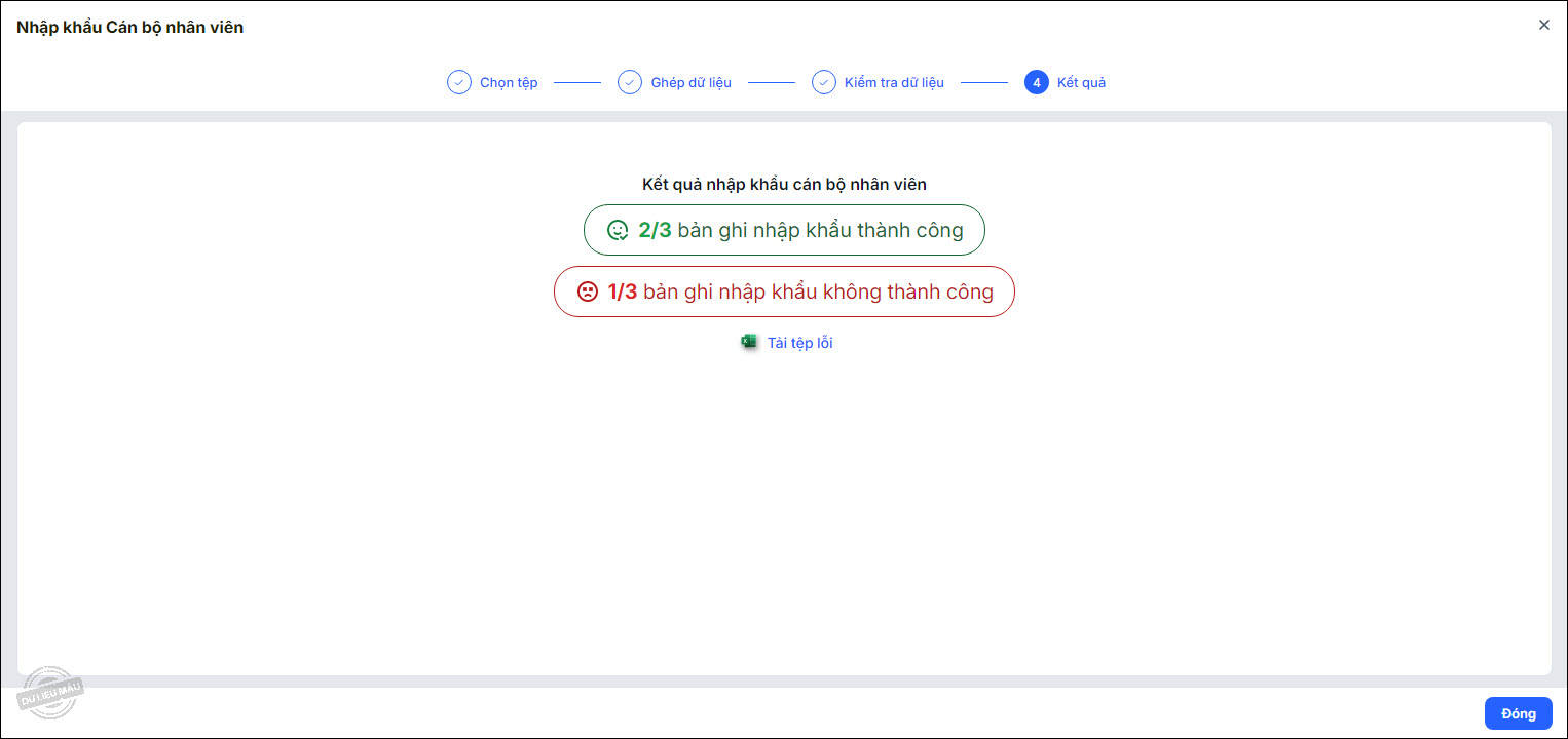 - Phần mềm hiển thị kết quả nhập khẩu. Trường hợp có bản ghi nhập khẩu không thành công, có thể chọn Tải tệp lỗi để xem chi tiết.