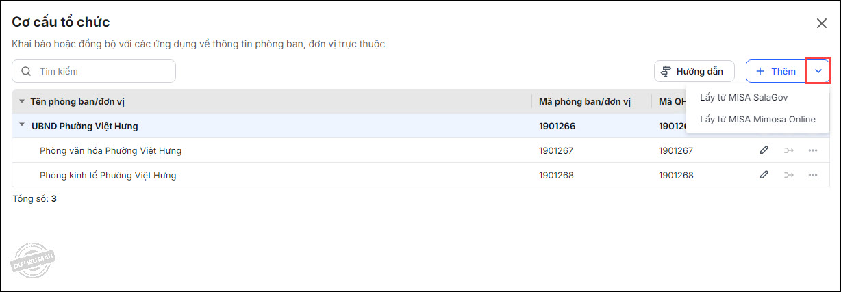 - Có thể lấy cơ cấu tổ chức từ ứng dụng MISA Salagov hoặc MISA Mimosa Online lên nền tảng bằng cách nhấn vào biểu tượng cạnh nút Thêm, chọn Lấy từ MISA Salagov hoặc Lấy từ MISA Mimosa Online. Ví dụ chọn Lấy từ MISA Salagov.