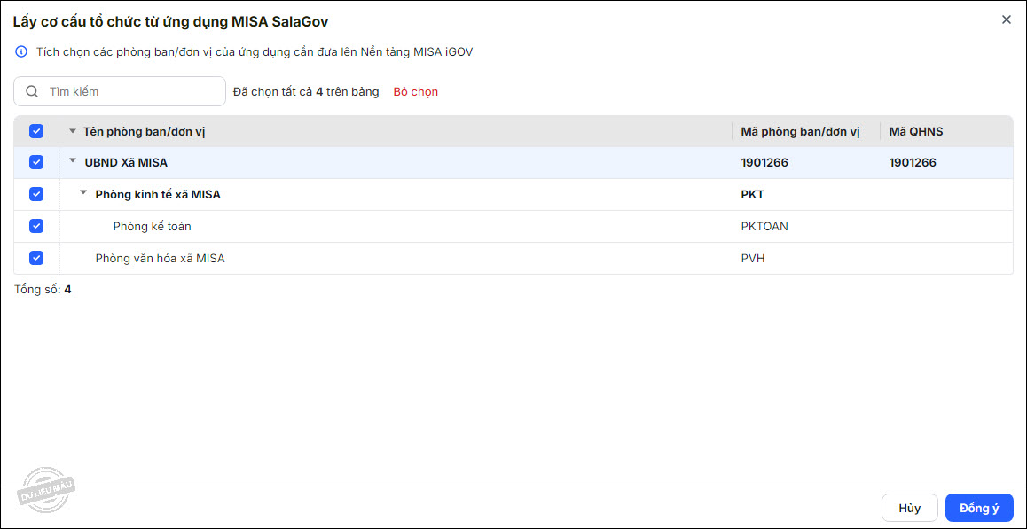- Tích chọn các phòng ban cần đưa lên nền tảng MISA iGOV. Nhấn Đồng ý.