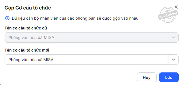 - Trường hợp có phòng ban trùng lặp nhau, chọn chức năng Gộp cơ cấu tổ chức để gộp các phòng ban không có mã QHNS vào 1 cơ cấu tổ chức chi tiết nhất.