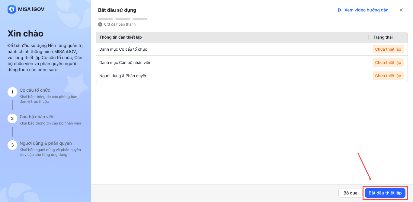 1. Khi anh/chị đăng nhập lần đầu vào nền tảng MISA iGOV, hệ thống hiển thị màn hình Bắt đầu sử dụng. Nhấn Bắt đầu thiết lập.