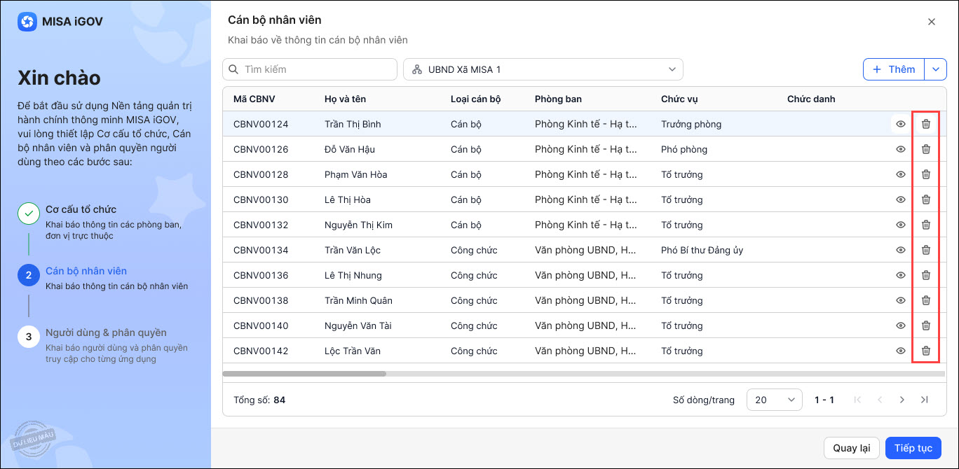 4. Có thể xóa CBNV bằng cách chọn vào biểu tượng Xóa tại dòng thông tin CBNV.
