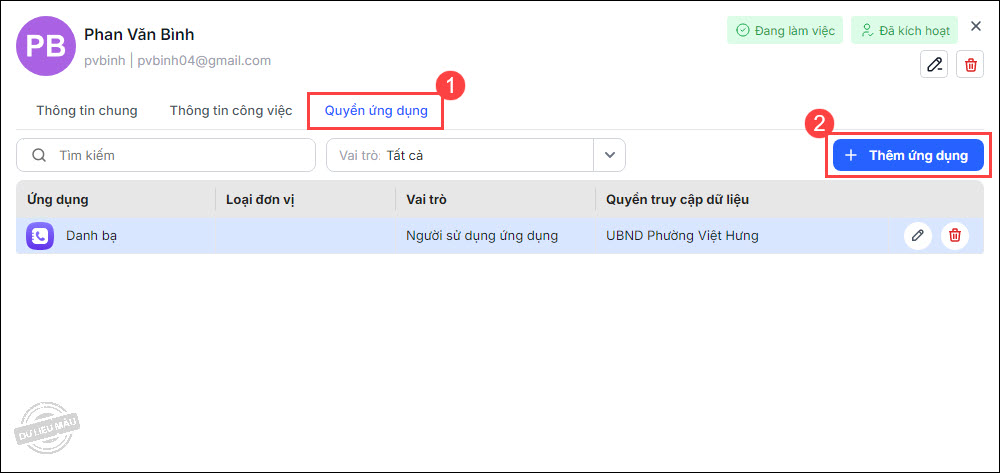 Nhấn đúp chuột tại người dùng, vào mục Quyền ứng dụng, nhấn Thêm ứng dụng.