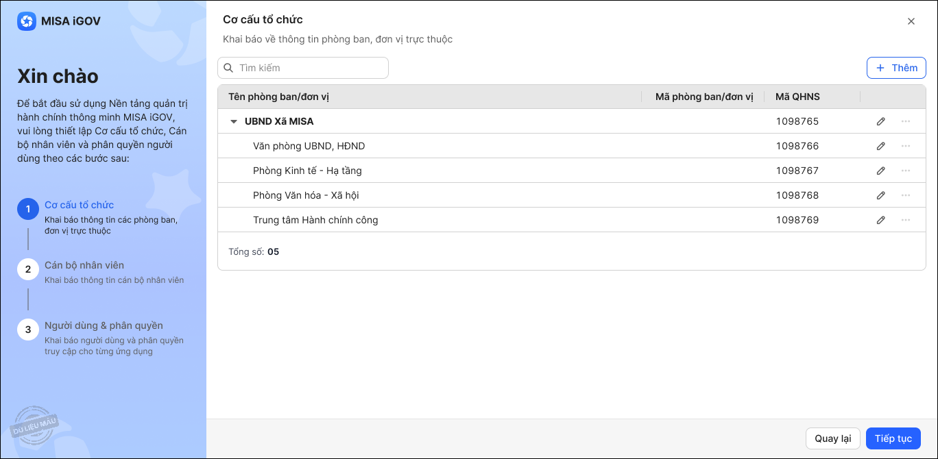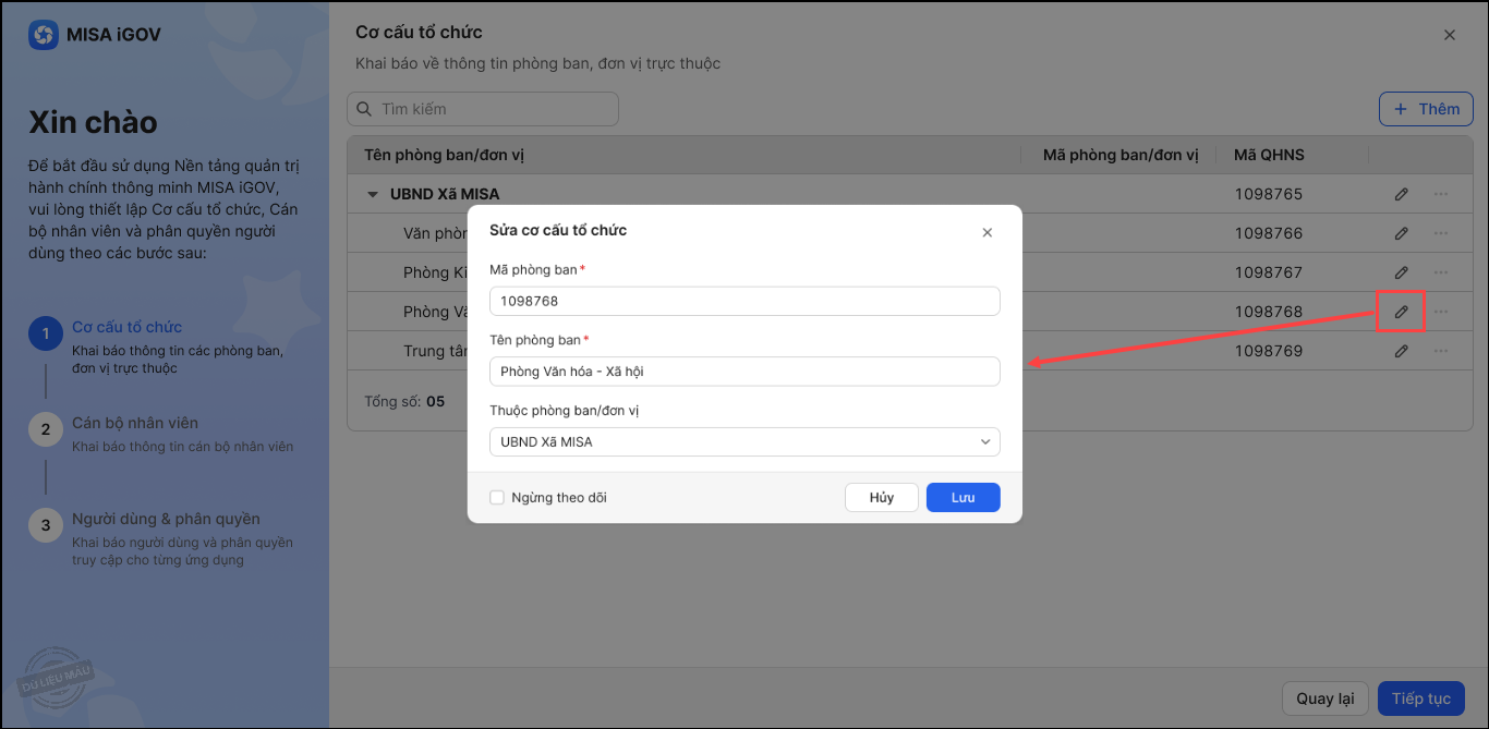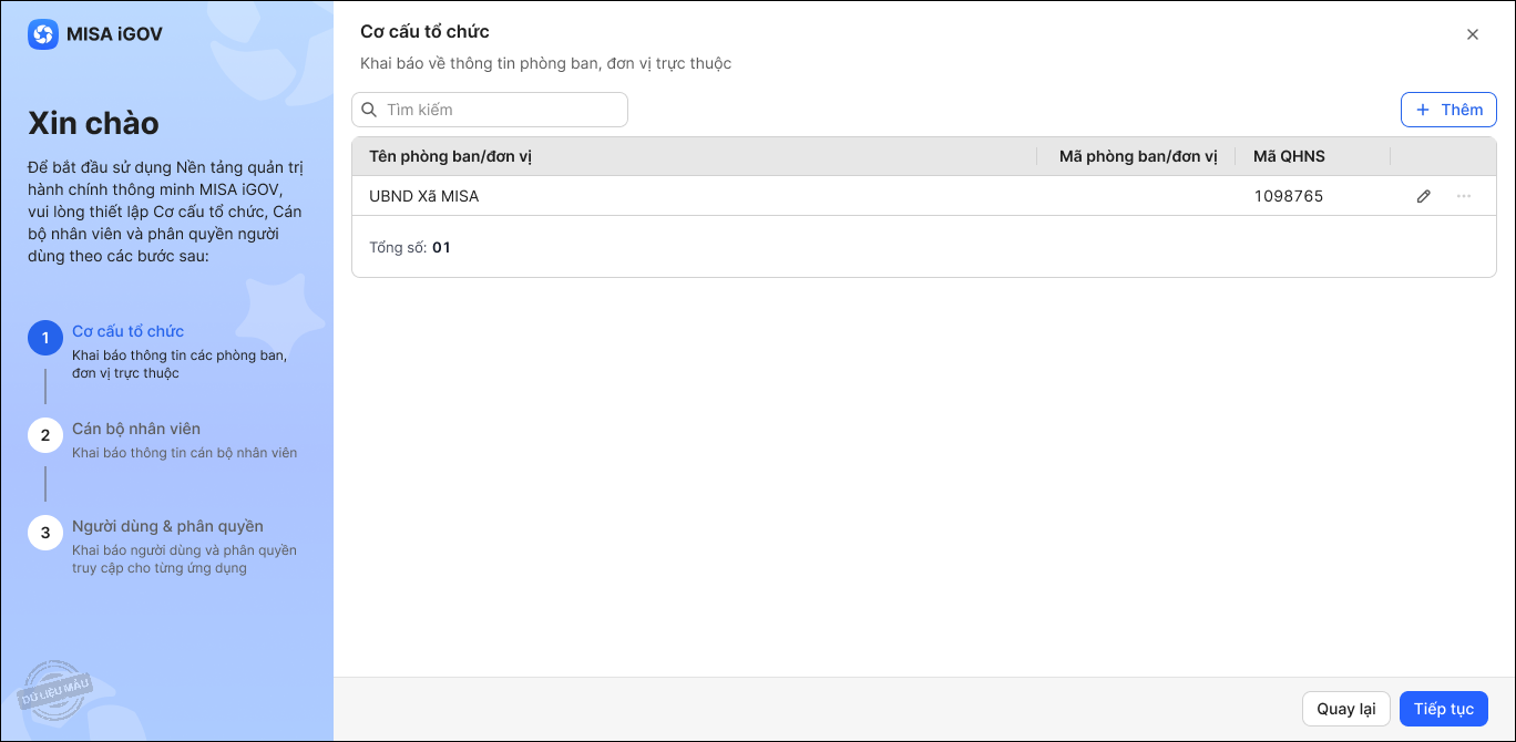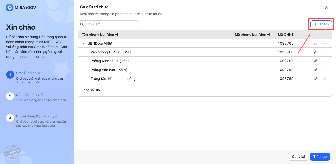 - Nếu không cần khai báo thêm phòng ban mới, có thể chuyển luôn sang bước tiếp theo bằng cách nhấn Tiếp tục.