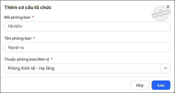 - Khai báo thông tin phòng ban: Mã phòng ban, Tên phòng ban, Thuộc phòng ban/đơn vị. Nhấn Lưu.