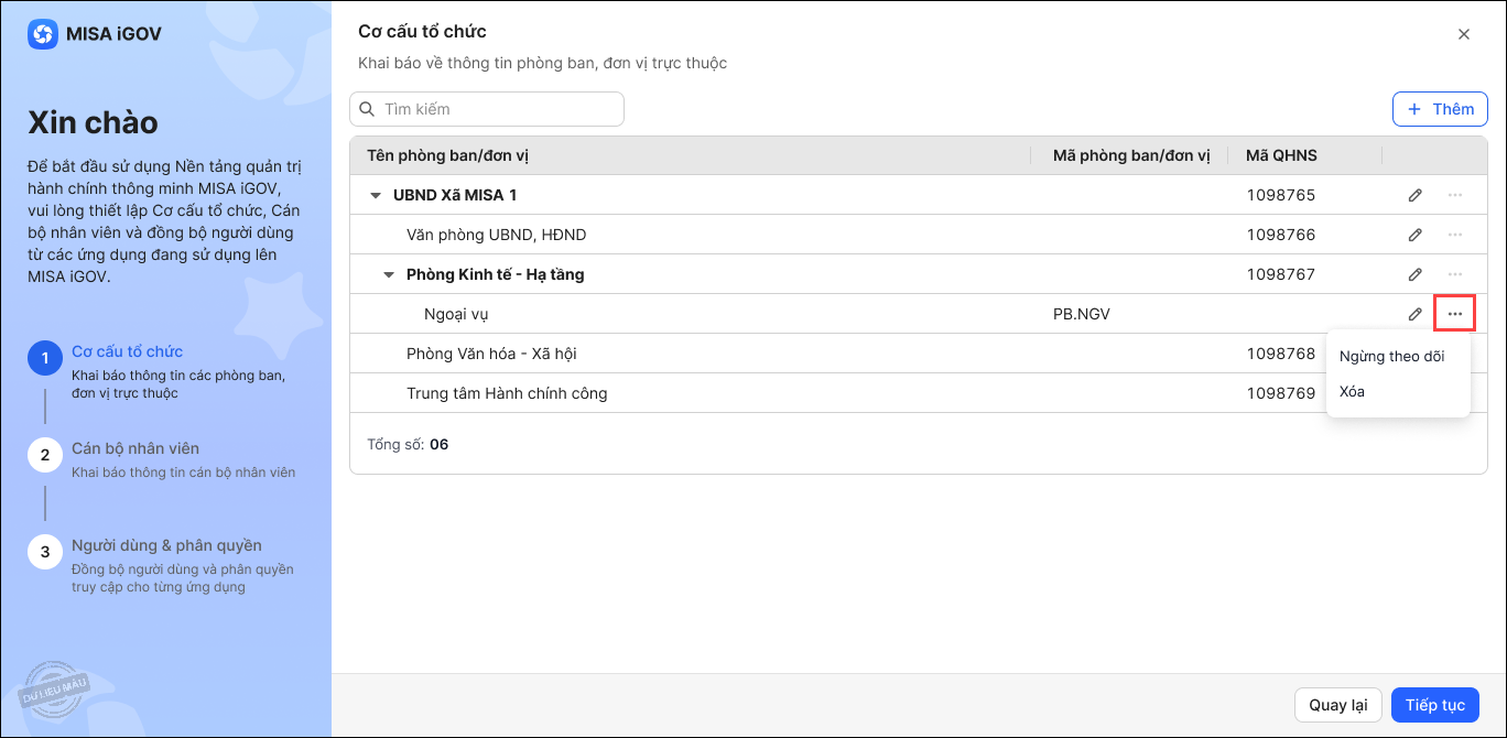 5. Có thể chọn ngừng theo dõi hoặc xóa phòng ban đang có bằng cách nhấn vào biểu tượng ⋯ ở cuối dòng và chọn chứng năng tương ứng.