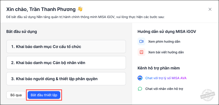 1. Khi anh/chị đăng nhập lần đầu vào nền tảng MISA iGOV, hệ thống hiển thị màn hình Bắt đầu sử dụng. Nhấn Bắt đầu thiết lập.