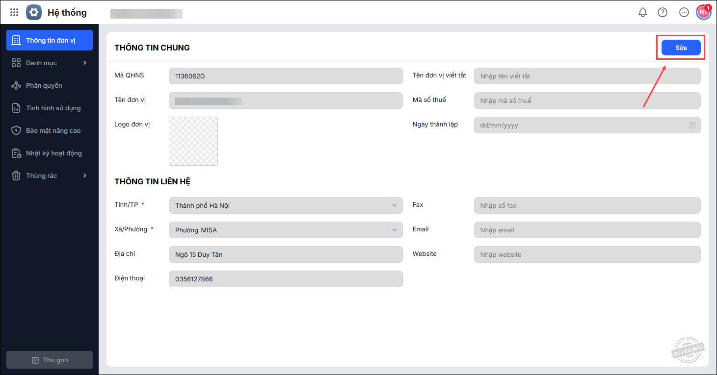 2. Tại mục Thông tin đơn vị, chương trình tự động lấy lên nội dung theo thông tin đăng ký sử dụng phần mềm. Nhấn Sửa để khai báo bổ sung và chỉnh sửa thông tin cần thiết.
