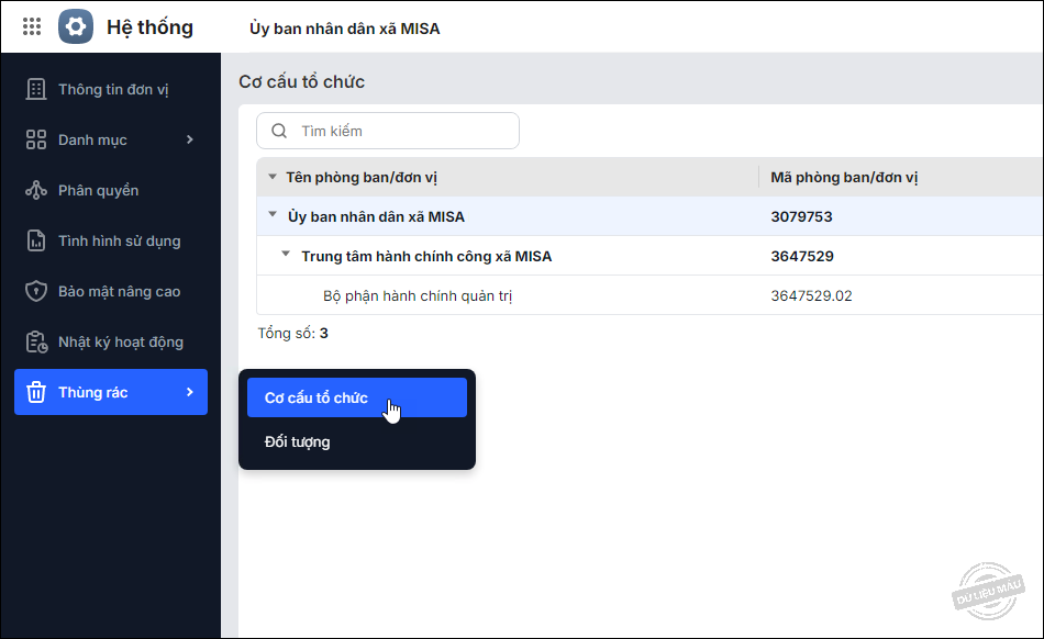 - Vào Thùng rác\Cơ cấu tổ chức.