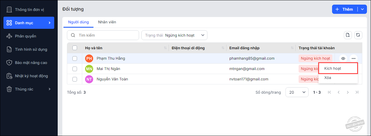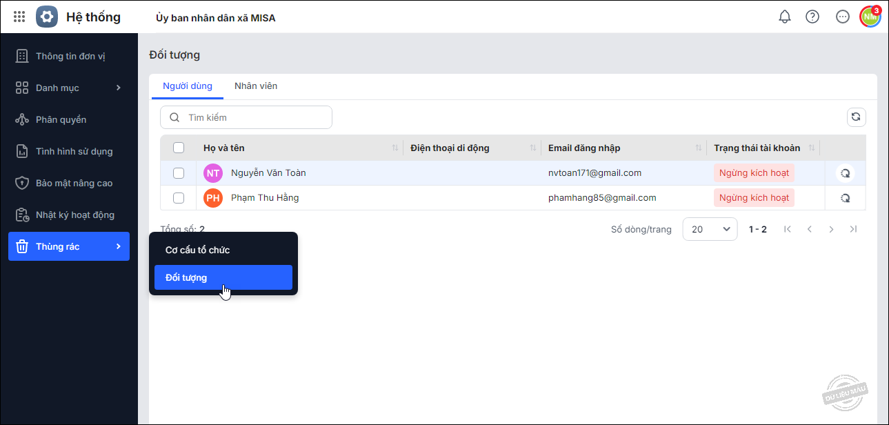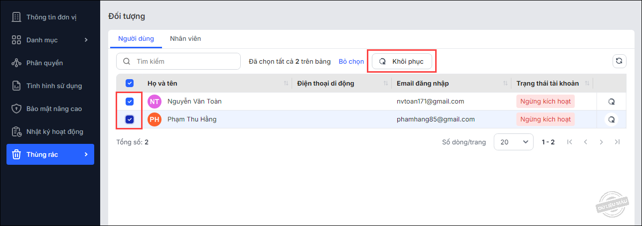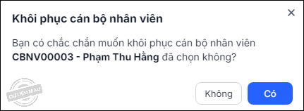 Lưu ý: Khi khôi phục người dùng/CBNV, đối tượng đó vẫn ở trạng thái Ngừng kích hoạt, quản trị hệ thống cần vào Danh mục\Đối tượng để thực hiện kích hoạt lại.