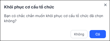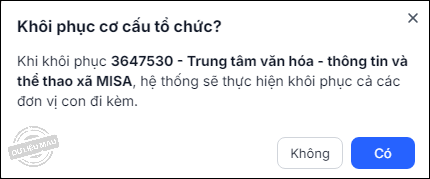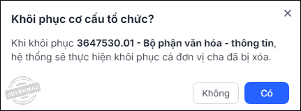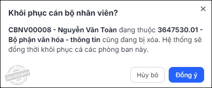 Khi chọn khôi phục, hệ thống sẽ khôi phục cả phòng ban/đơn vị cấp trên và các phòng ban/đơn vị con thuộc phòng ban/đơn vị này.