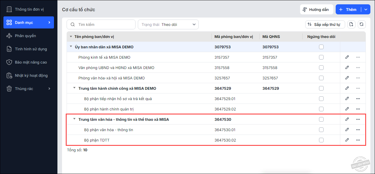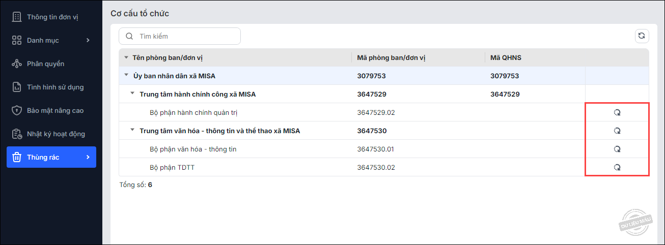 - Để khôi phục lại phòng ban/đơn vị đã bị xóa, chọn phòng ban/đơn vị cần khôi phục, nhấn vào biểu tượng ⟳ ở cuối dòng.