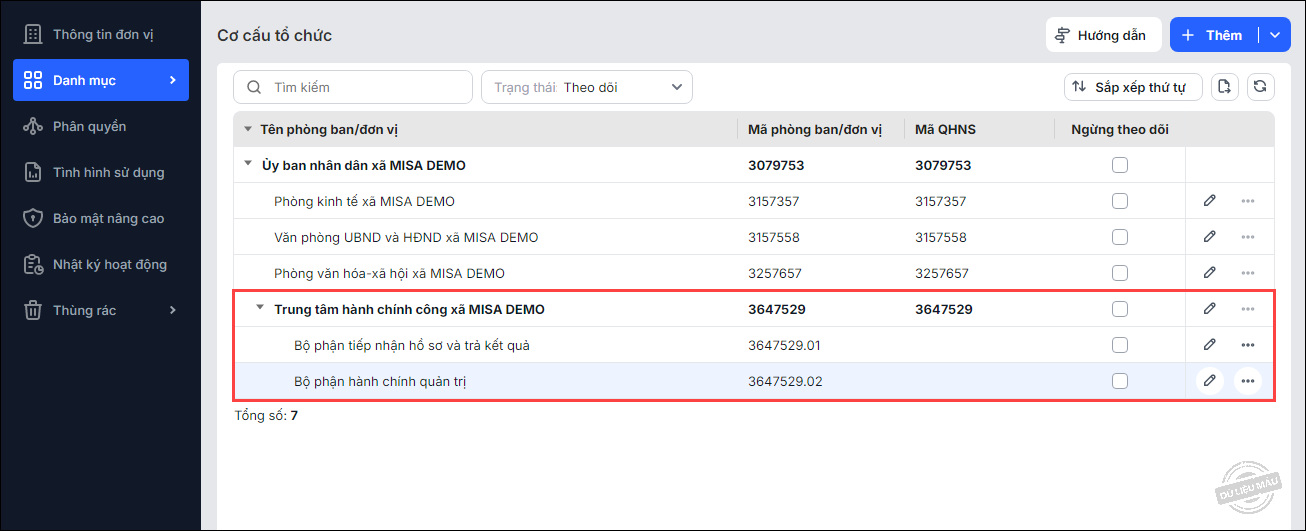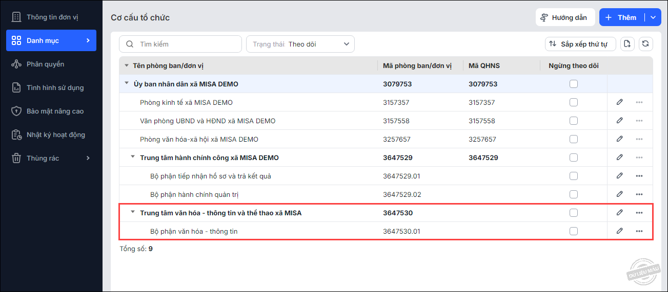 Ví dụ: Khi khôi phục Trung tâm văn hóa – thông tin và thể thao, hệ thống tự động khôi phục cả các phòng ban con là Bộ phận văn hóa – thông tin và Bộ phận TDTT.