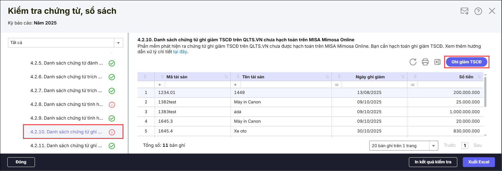 Trường hợp các tài sản cố định đã được ghi giảm trên phần mềm QLTS.VN nhưng quên chưa hạch toán trên Mimosa thì chương trình sẽ hiển thị báo cáo chi tiết tại phần 4.2.10 như sau: