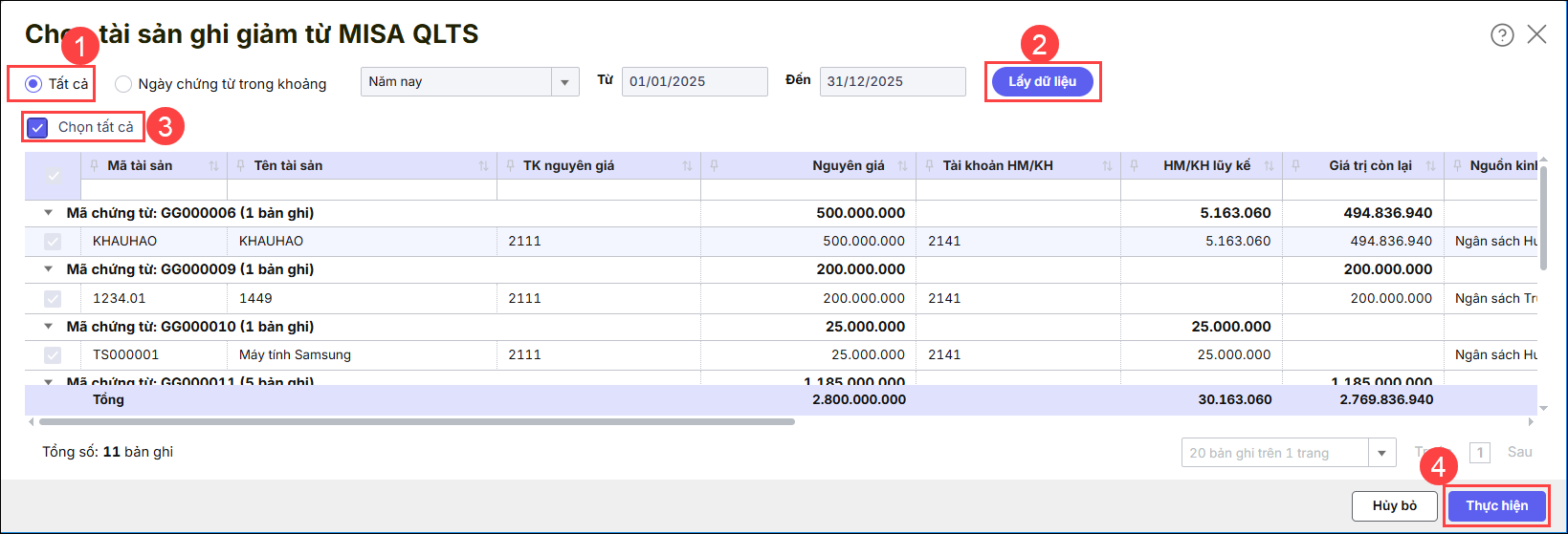 4.2.10. Danh sách tài sản đã ghi giảm trên QLTS nhưng quên chưa hạch toán ghi giảm tài sản nên không hiển thị trên Sổ cái