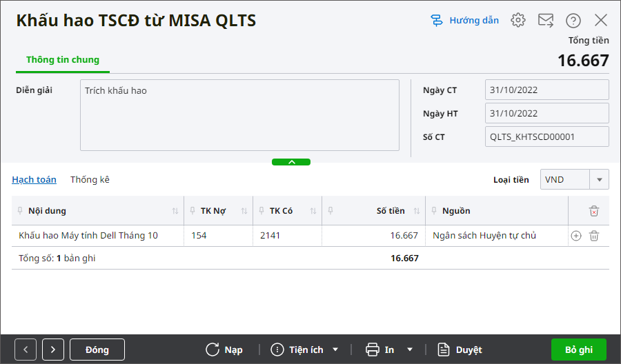 2. Đóng màn hình Hướng dẫn quyết toán lại, mở danh sách khấu hao TSCĐ để xem chứng từ khấu hao trên QLTS là chứng từ nào.
