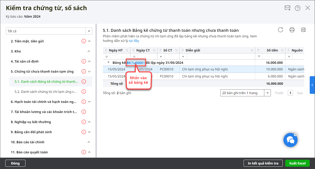 Bài viết này hướng dẫn anh/chị cách kiểm tra và xử lý khi thực hiện kiểm tra chứng từ, sổ sách phần mềm cảnh báo có bảng kê chứng từ thanh toán chưa thanh toán, từ đó kiểm tra được bảng kê nào chưa được thanh toán thì thực hiện thanh toán để lên đúng số liệu báo cáo đối chiếu, báo cáo quyết toán.