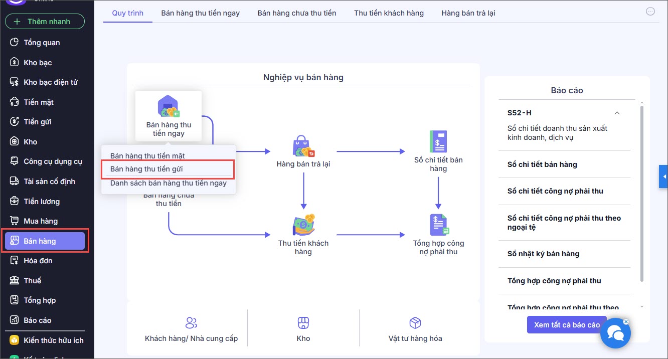 Bước 1: Vào nghiệp vụ Bán hàng, chọn Bán hàng thu tiền ngay\Bán hàng thu tiền gửi.
