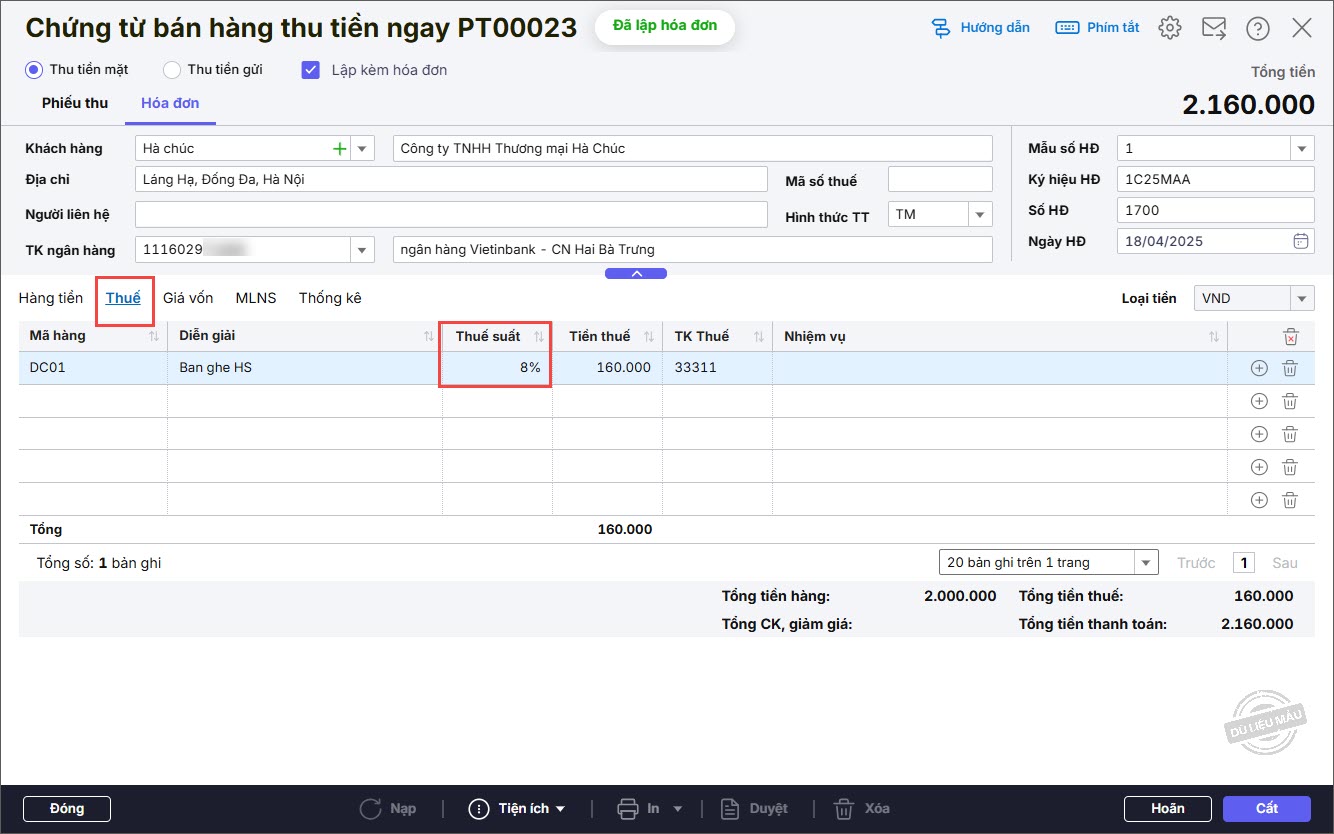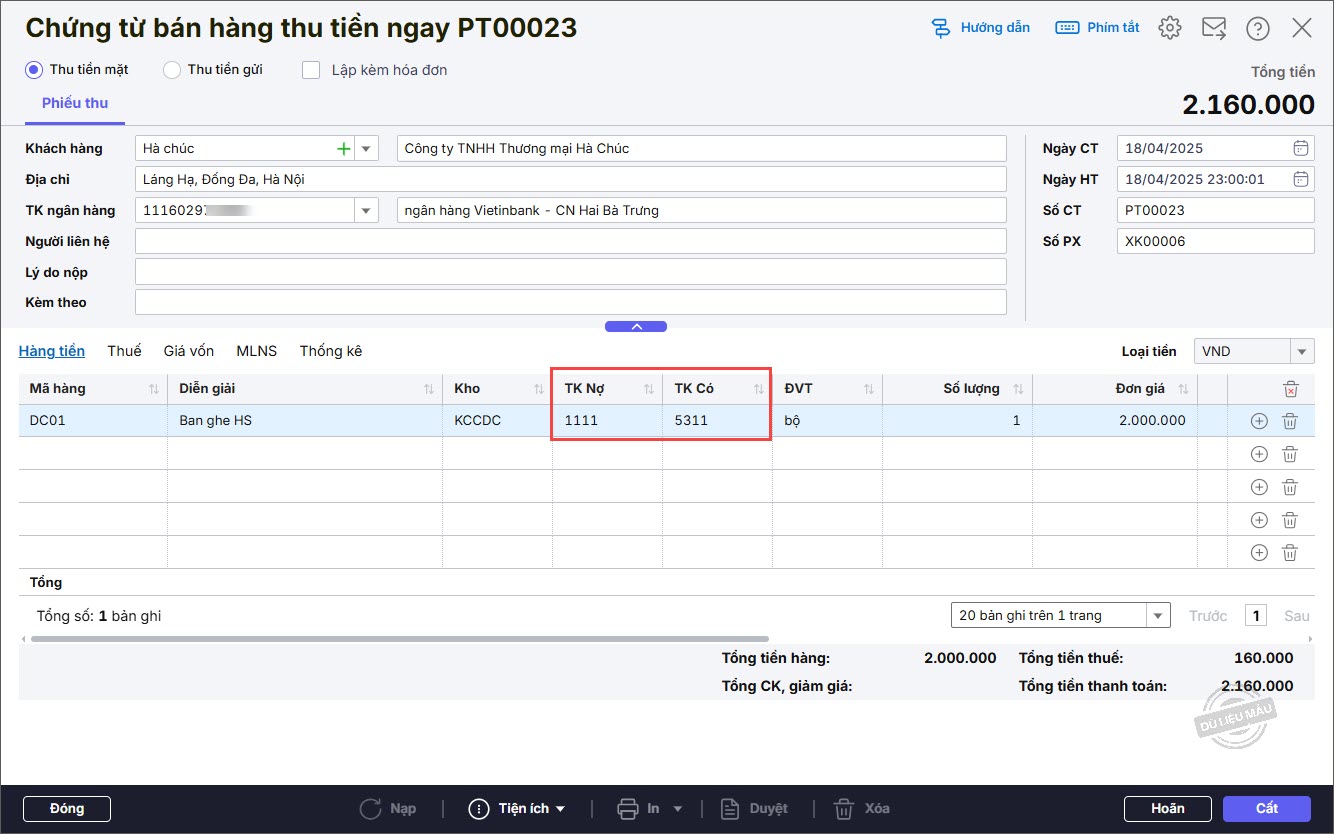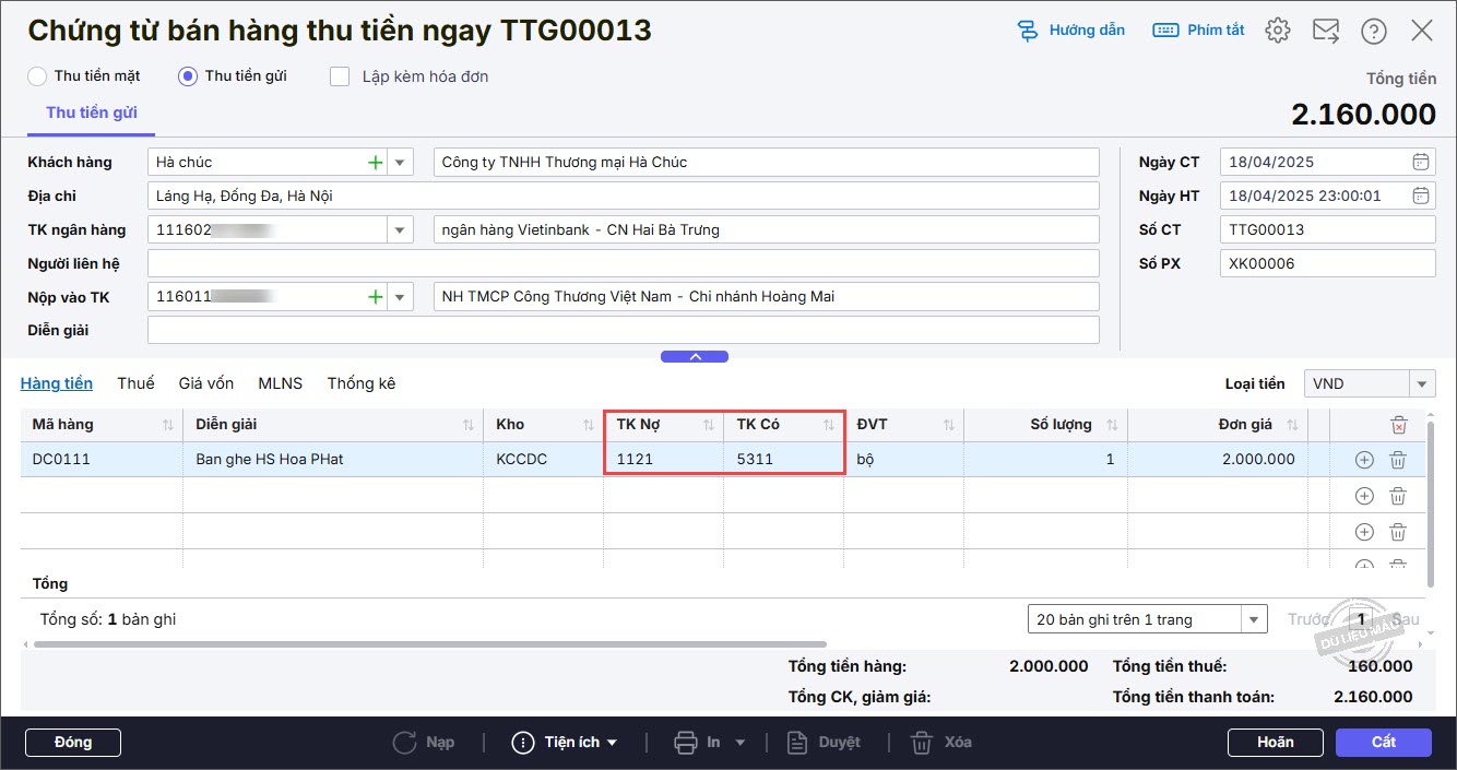 Bước 2: Khai báo các thông tin chứng từ Thu tiền gửi từ bán hàng.