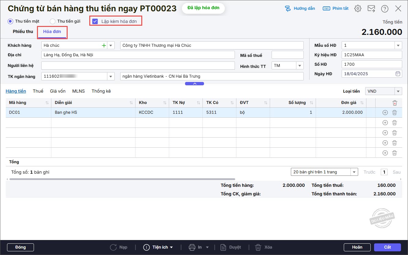 - Nếu tích chọn Lập kèm hóa đơn, anh/chị chọn tab Hóa đơn và nhập thông tin Hóa đơn: Mẫu số HĐ, Ký hiệu HĐ, Số HĐ, Ngày HĐ.