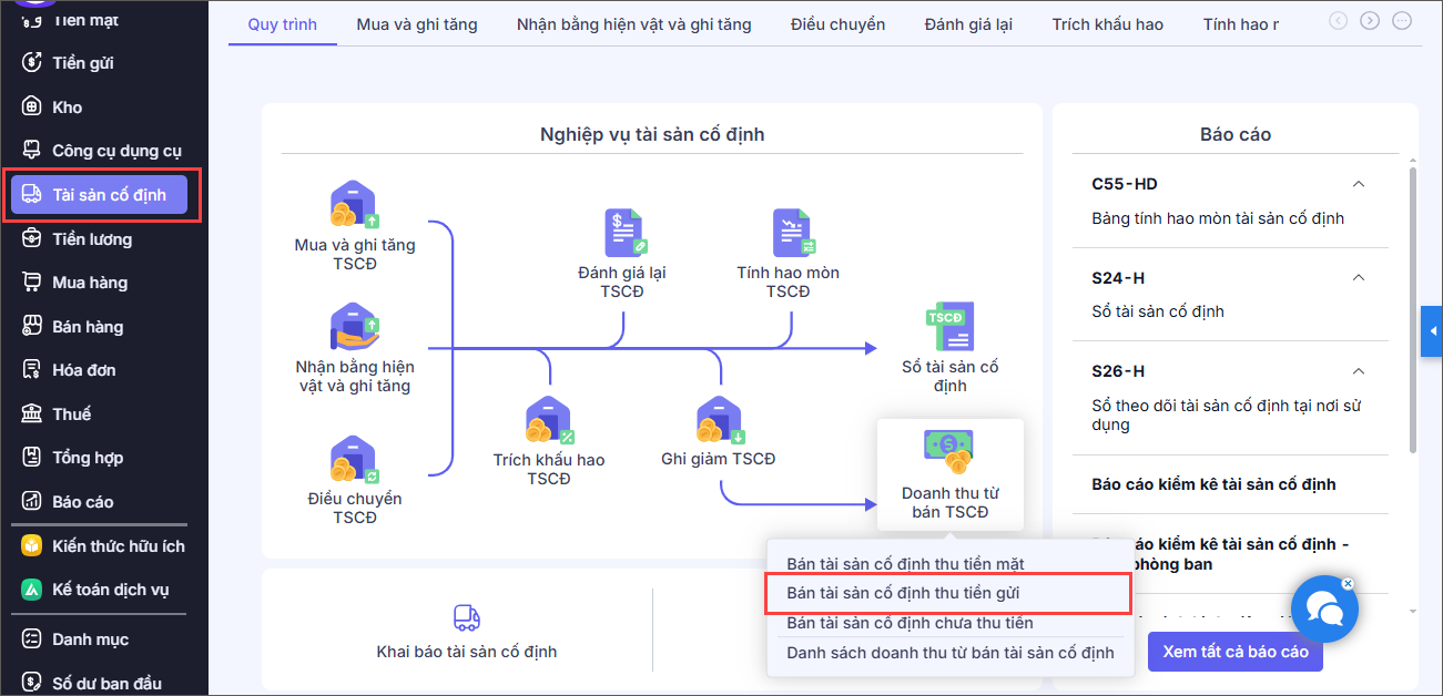 1. Vào nghiệp vụ Tài sản cố định, chọn Doanh thu từ bán TSCĐ\Bán tài sản cố định thu tiền gửi.