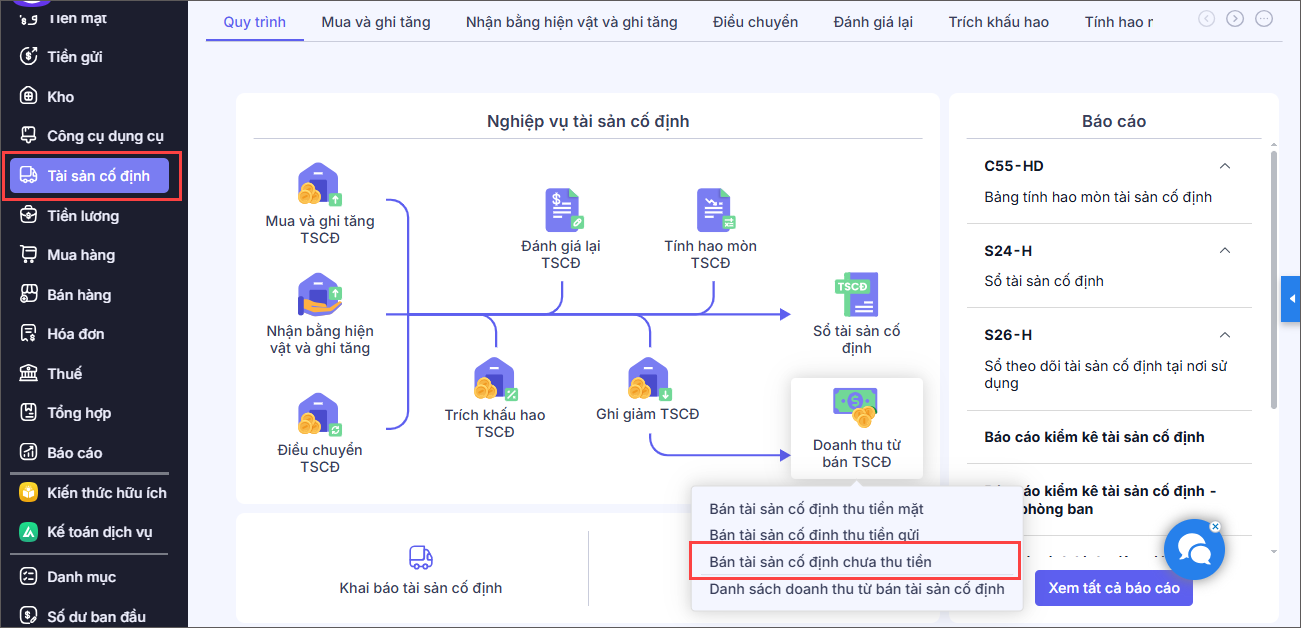 1. Vào nghiệp vụ Tài sản cố định, chọn Doanh thu từ bán TSCĐ\Bán tài sản cố định chưa thu tiền.
