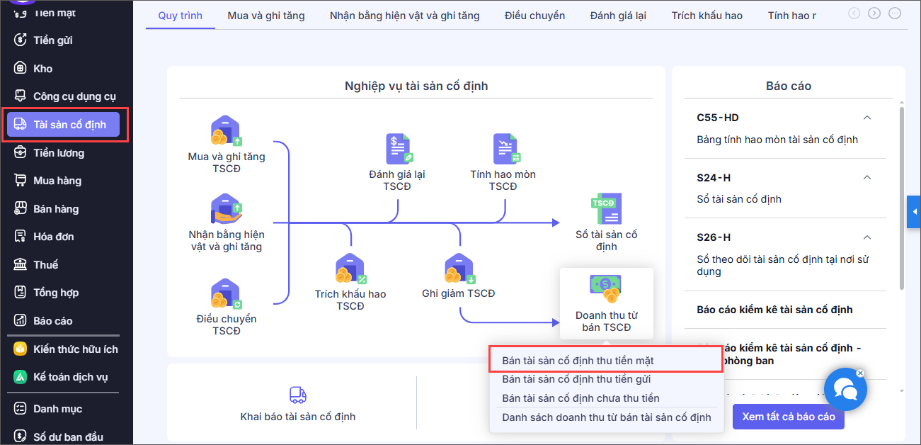 1. Vào nghiệp vụ Tài sản cố định, chọn Doanh thu từ bán TSCĐ\Bán tài sản cố định thu tiền mặt.