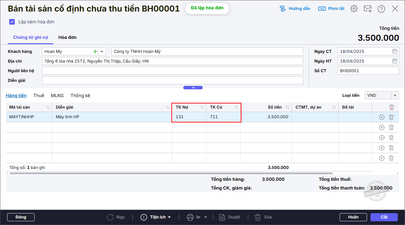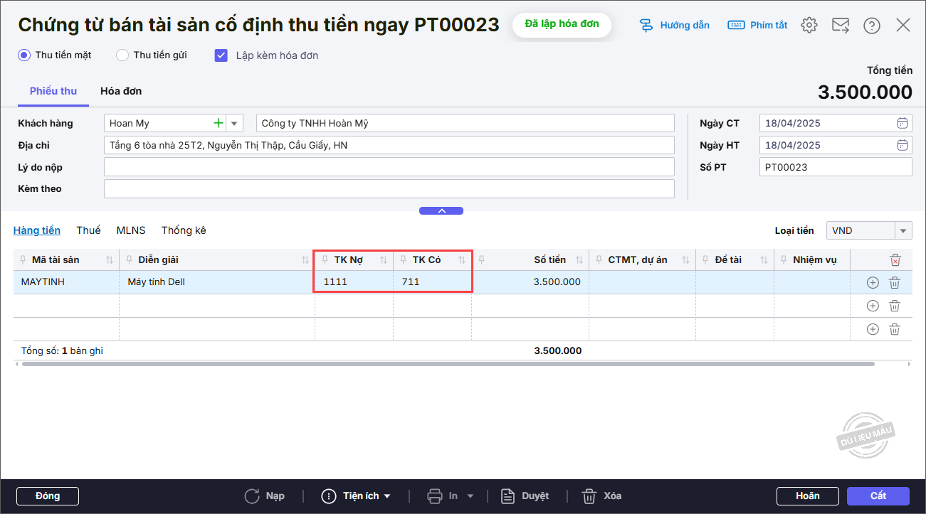 - Nhập thông tin chi tiết chứng từ: Mã hàng, TK Nợ mặc định là 131, TK Có 711,33311 3338, Số tiền.