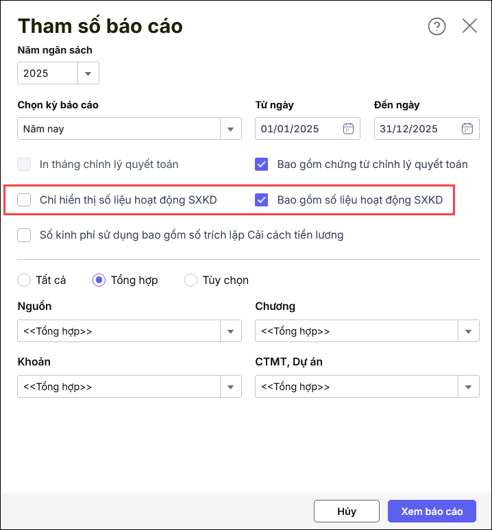 Tình huống này thường xảy ra tại các đơn vị có phát sinh thu chi sản xuất kinh doanh như: Căn tin, trông giữ xe, thu học phí, thu viện phí, hoạt động liên doanh liên kết hoặc các hoạt động sản xuất kinh doanh (SXKD) khác nhưng khi in báo cáo số liệu không có số liệu hoặc không hiển thị số liệu.