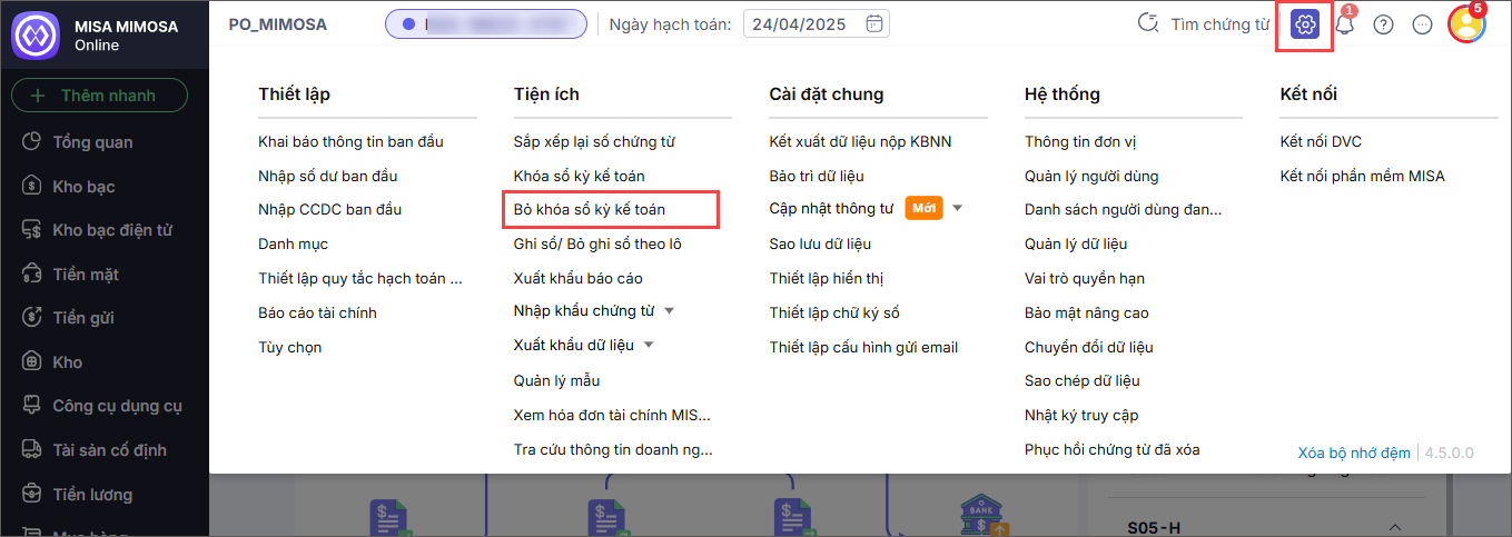 Bước 1: Vào Bánh răng ⚙(góc phải bên trên)\Tiện ích\Bỏ khóa sổ kỳ kế toán.