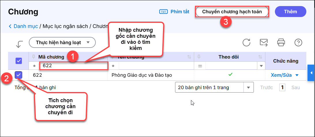 Bước 4: Tại màn hình danh sách chương, chọn chức năng Chuyển chương hạch toán.
