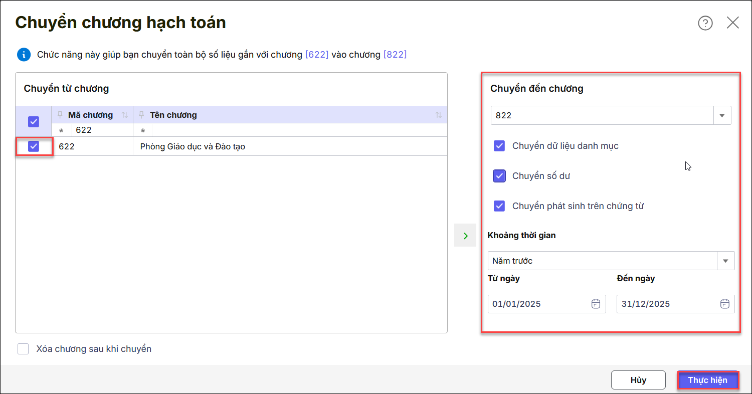 - Chuyển số dư: Chuyển số dư đầu kỳ từ chương gốc sang chương đích.