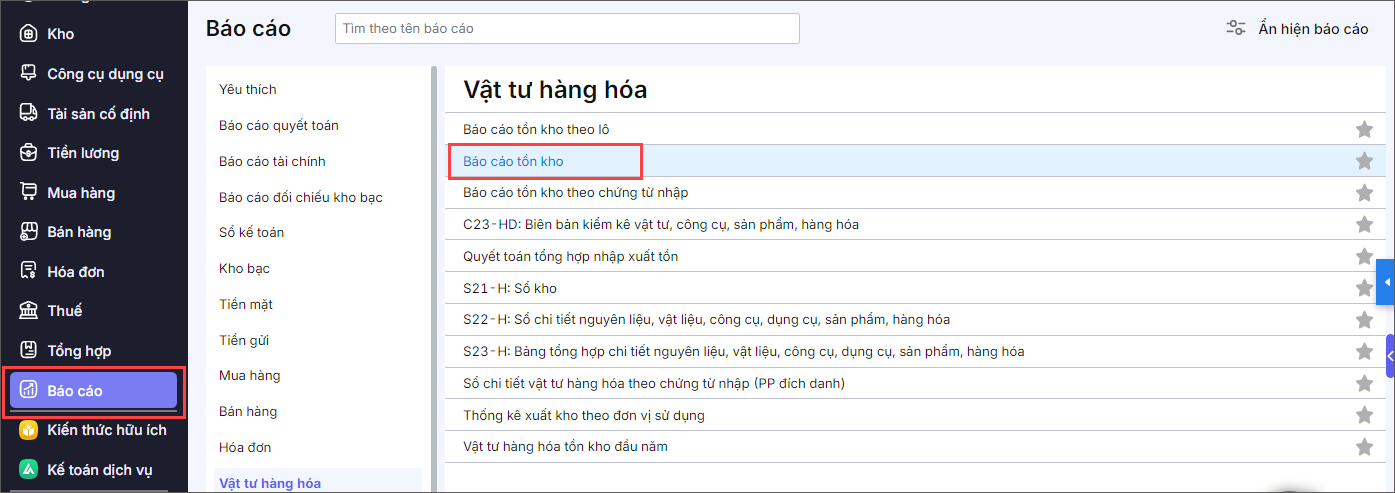 Bước 1: Vào menu Báo cáo\Vật tư hàng hóa\Kích đúp chuột vào Báo cáo tồn kho.